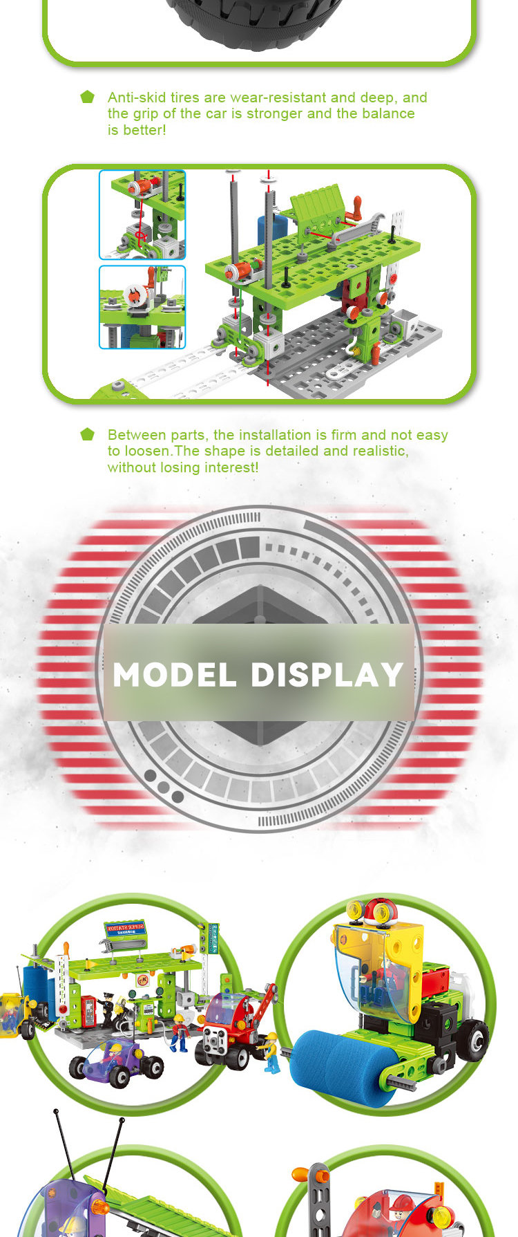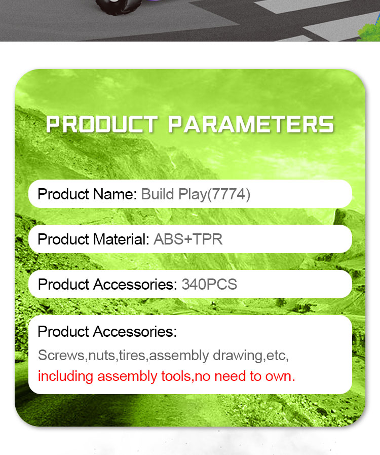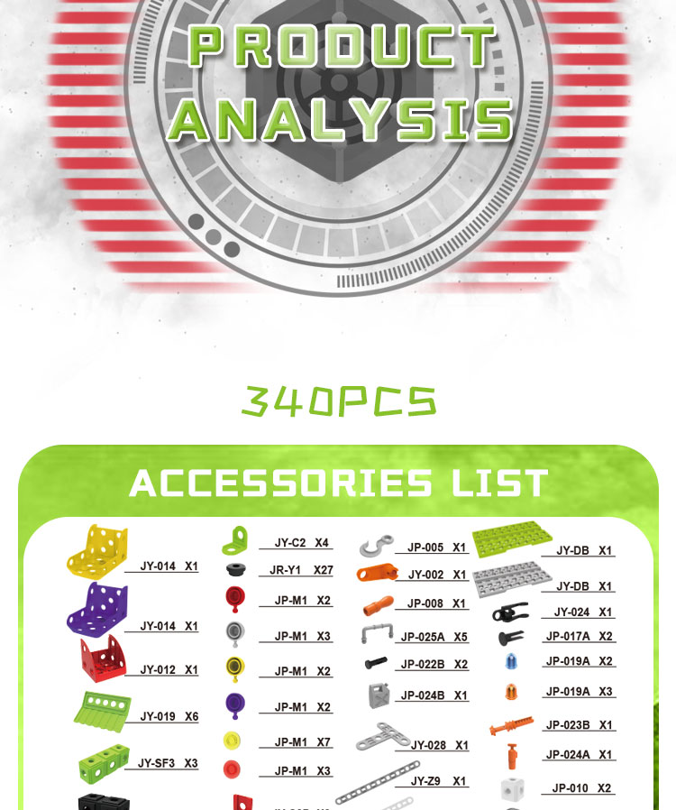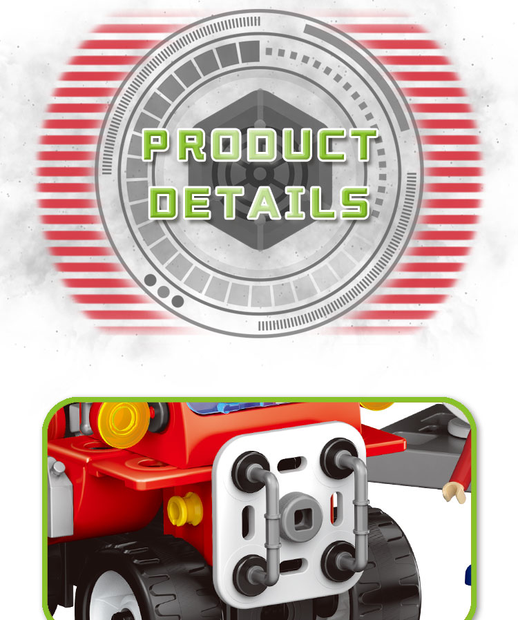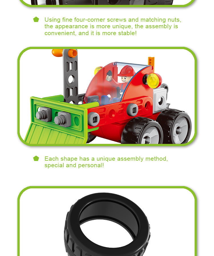 Tato zábavná stavebnice obsahuje šrouby, matice, pneumatiky, montážní nářadí a další příslušenství, které má celkem 340 dílů.Lze jej sestavit do 10 různých modelů (pokaždé lze postavit pouze jeden tvar, po dokončení jednoho skládání modelu mohou děti model rozebrat a pokračovat ve skládání dalšího modelu).Poskytneme papírový návod, který dětem pomůže hračku postavit.Kromě těchto 10 modelů, které poskytujeme, mohou děti flexibilně stavět kreativnější tvary, které mohou volně používat svou představivost.