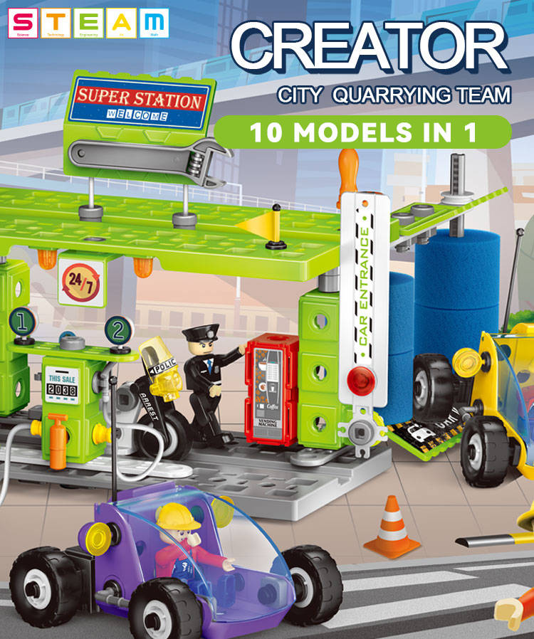 340 KS 10 v 1 pro děti Stavební cihly čerpací stanice STEM Učící se šroub Nákladní automobil Auto Plastové DIY montážní hračky pro děti