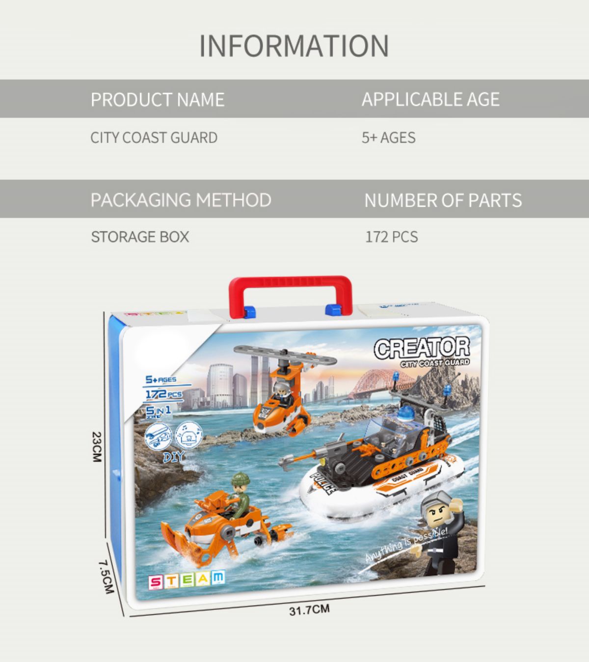 ಸಿಟಿ ಕೋಸ್ಟ್ ಗಾರ್ಡ್ಗಾಗಿ ಅಂತಿಮ DIY ಜೋಡಿಸುವ ಆಟಿಕೆ ಸೆಟ್ ಅನ್ನು ಬಹಿರಂಗಪಡಿಸಿ!ಸ್ಕ್ರೂಗಳು ಮತ್ತು ಬೀಜಗಳಿಂದ ವಿವಿಧ ಆಕಾರಗಳನ್ನು ಮಾಡಲು ನಿಮ್ಮ ಯುವಕರು 172 ತುಣುಕುಗಳನ್ನು ಬಳಸಬಹುದು.ನಿಮ್ಮ ಕಲ್ಪನೆ, ಸೃಜನಶೀಲತೆ ಮತ್ತು ಕೌಶಲ್ಯವನ್ನು ಸುಧಾರಿಸಿ.ಅರಿವಿನ ಕಾರ್ಯ ಮತ್ತು ಪ್ರಾಯೋಗಿಕ ಕೌಶಲ್ಯಗಳನ್ನು ಹೆಚ್ಚಿಸಲು ಸೂಕ್ತವಾಗಿದೆ.