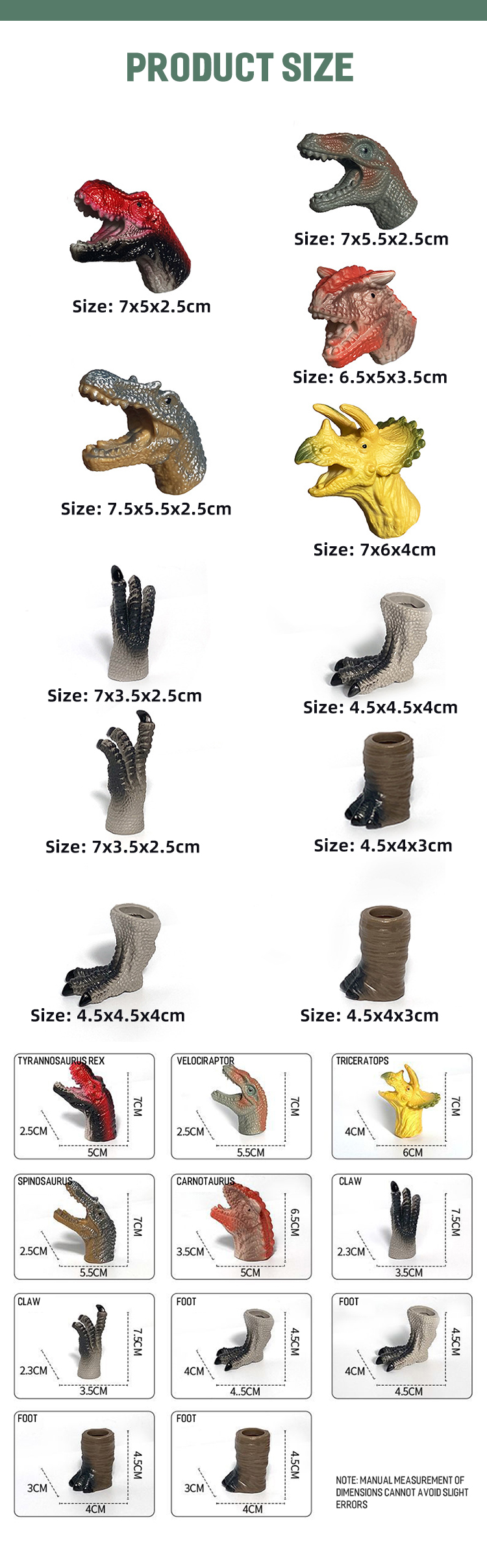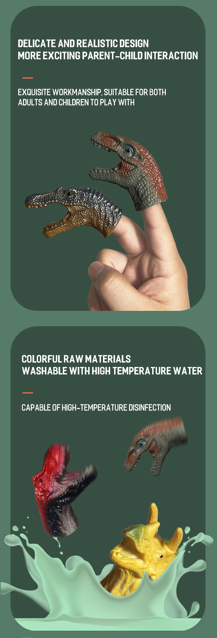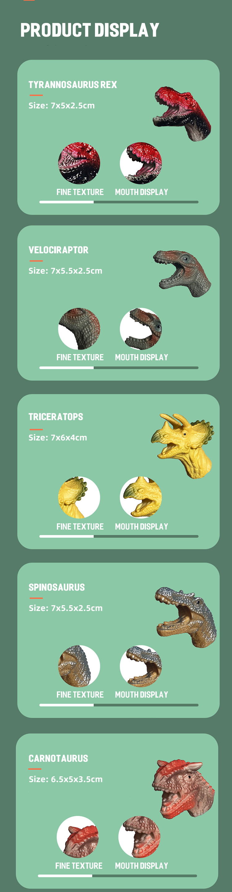 Setul de marionete cu degete are 5 stiluri de dinozaur, si anume tyrannosaurus rex, triceratops, ceratoceratops, velociraptor si spinosaurus.Acești dinozauri au un design exterior realist, fac copiii mai cufundați în joacă.