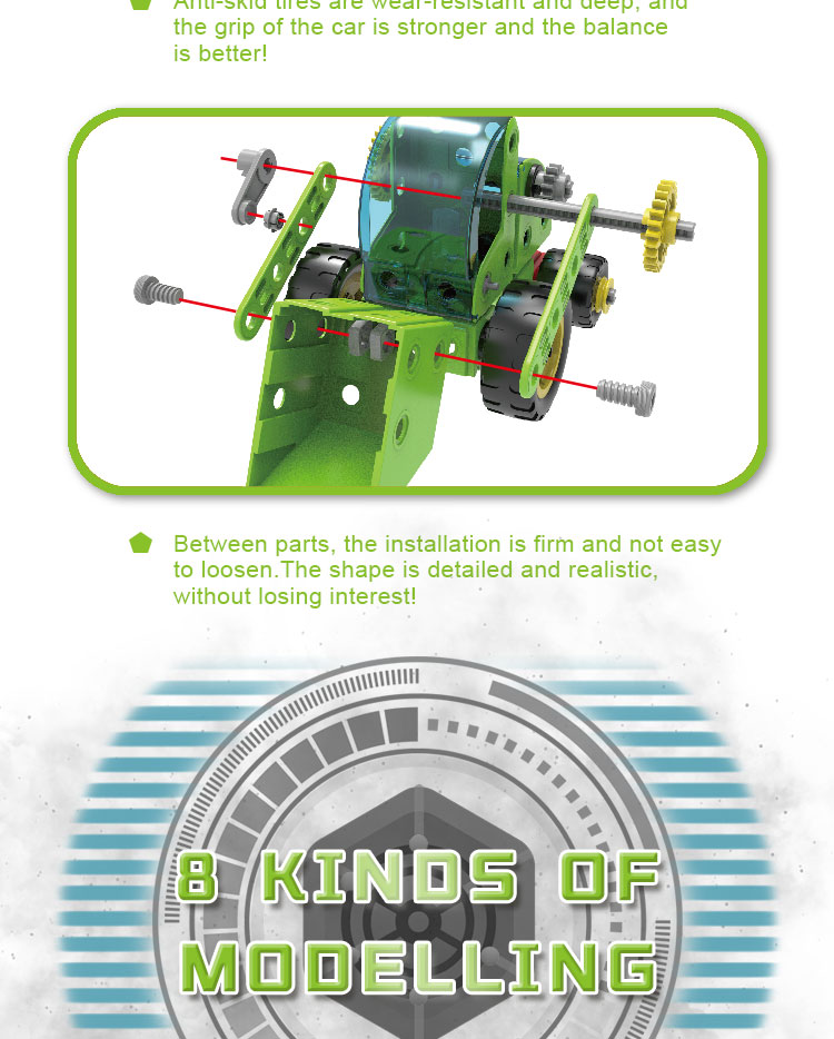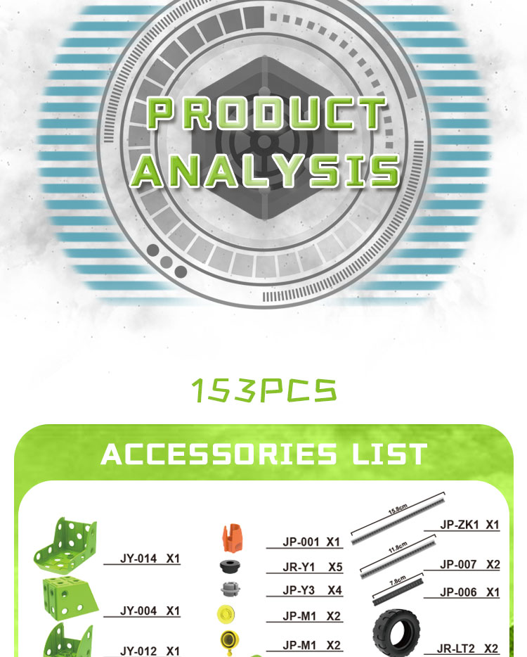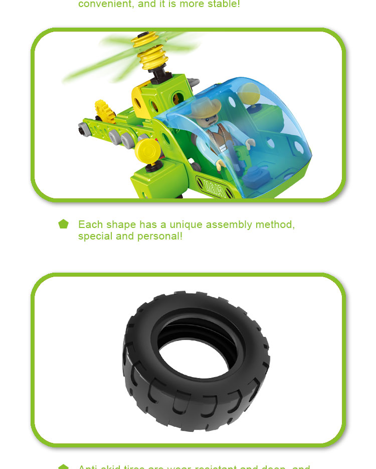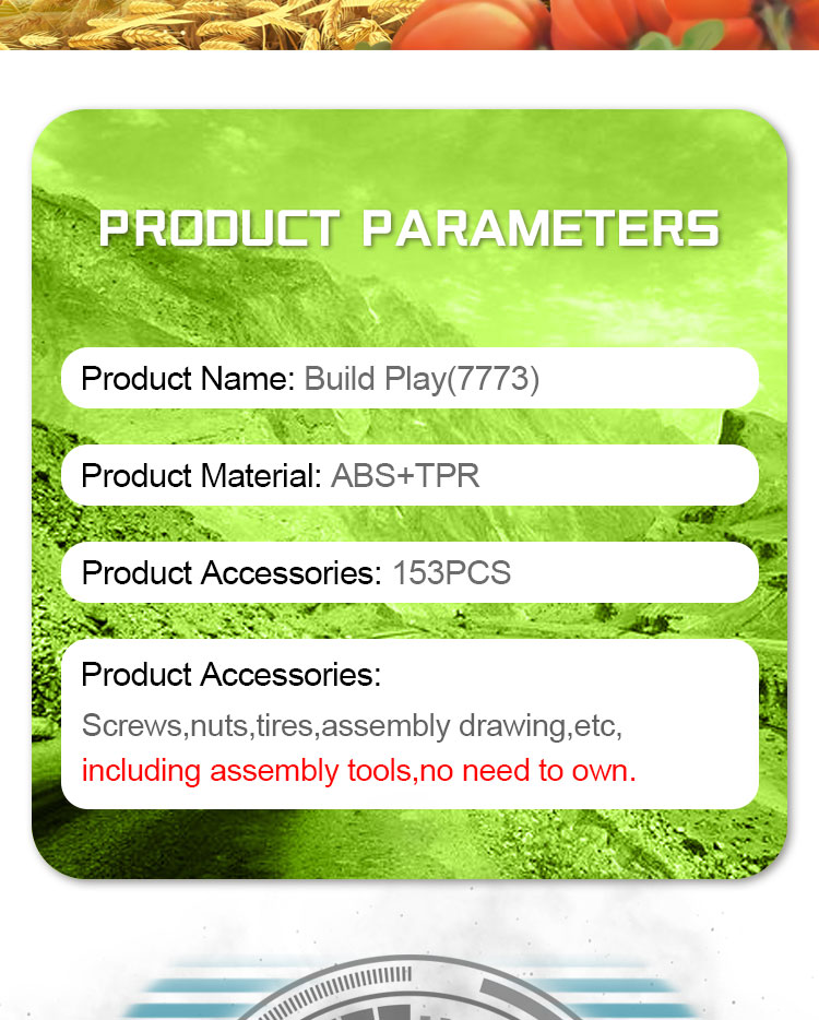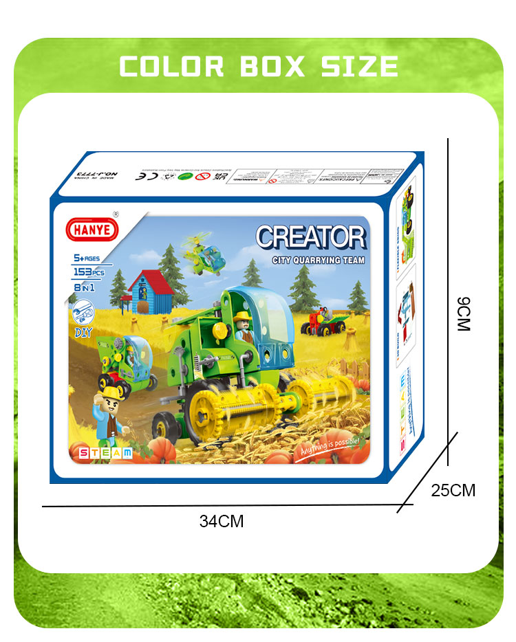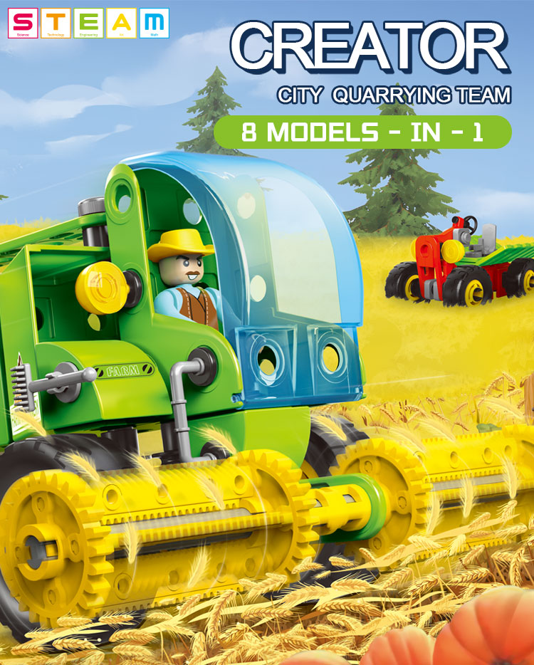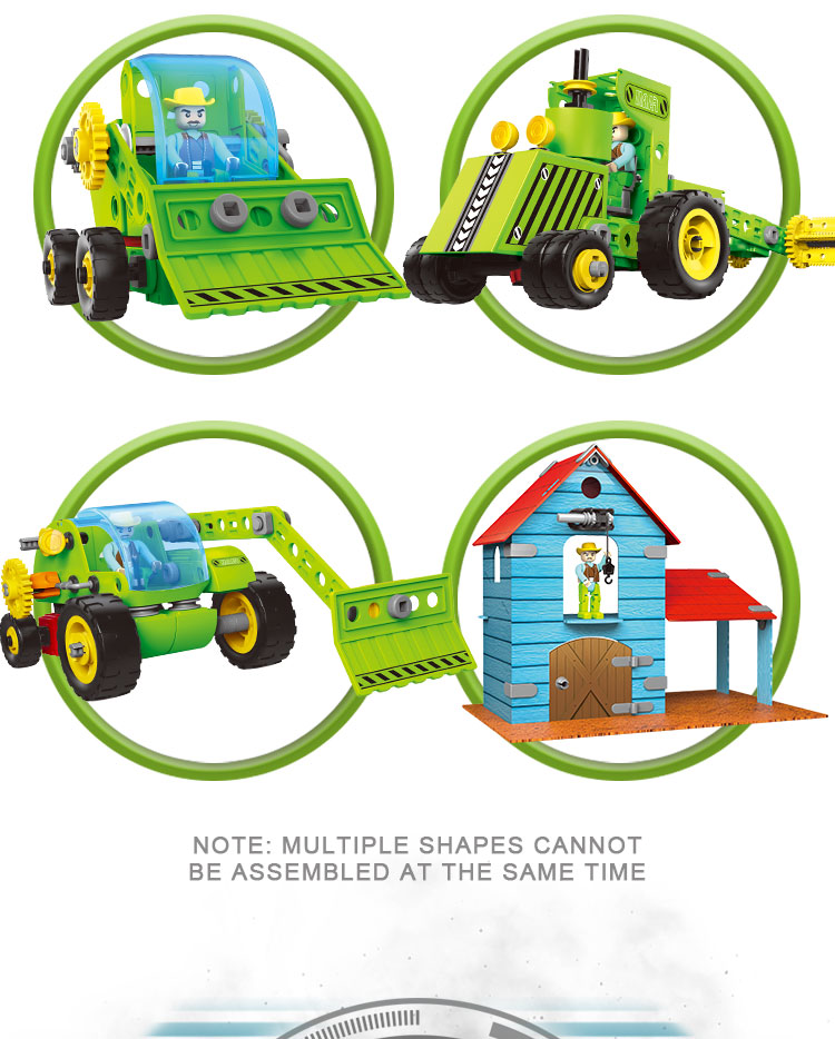 บล็อกตัวต่อของเล่นเด็กชิ้นนี้ประกอบด้วยชิ้นส่วน 153 ชิ้น สามารถประกอบเป็นยานพาหนะทางการเกษตรได้ 8 ชนิด (สามารถสร้างได้เพียงรูปทรงเดียวทุกครั้ง)เราจัดเตรียมคำแนะนำแบบกระดาษเพื่อช่วยให้เด็กๆ สร้างของเล่นต่างจากชุดอื่นๆ ที่มีเพียงโครงสร้างการประกอบแบบสกรู ชุดนี้จะเพิ่มชิ้นส่วนการก่อสร้างกระท่อมในฟาร์ม ทำให้มีฉากที่มุ่งเน้นและเล่นได้มากขึ้น