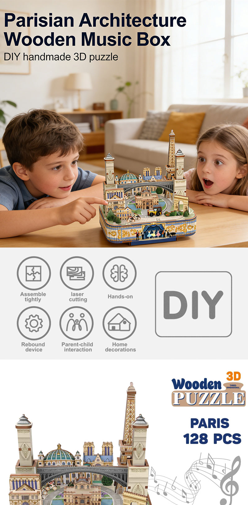 This product is a wooden DIY 3D puzzle themed around the classic architecture of romantic Paris. During assembly, children not only develop spatial thinking but also gain an intuitive feel for the geometric beauty and structural logic of architectural art, achieving architectural aesthetic enlightenment and cultural perspective.