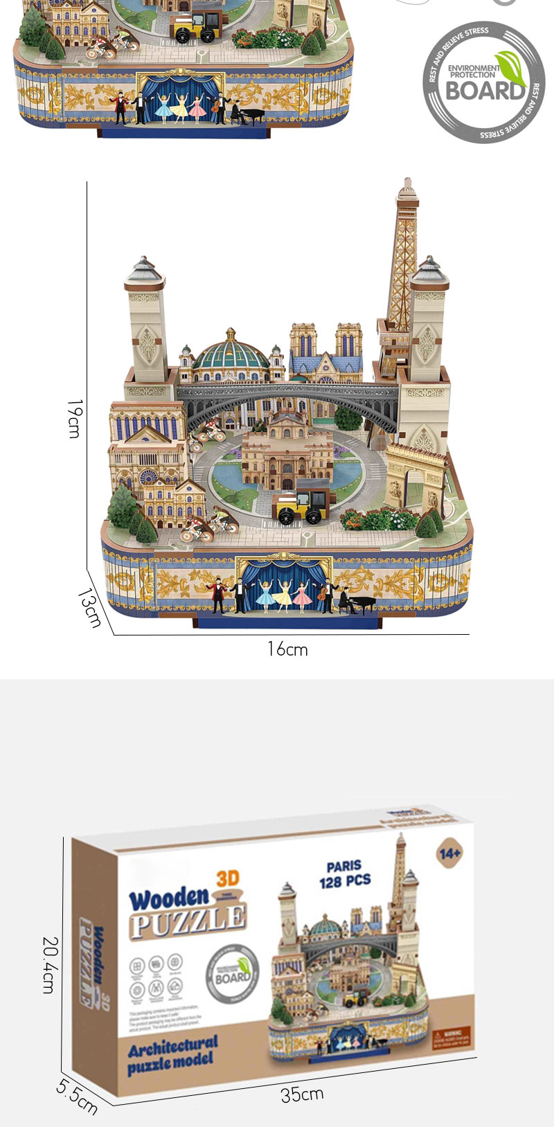 128PCS Wooden 3D Puzzle – Paris Architecture Music Box Rotating Model DIY Kit