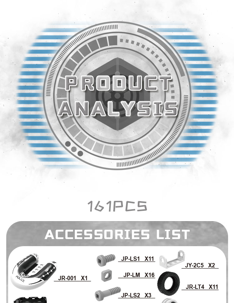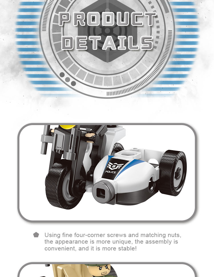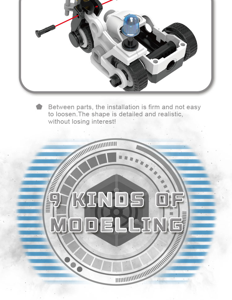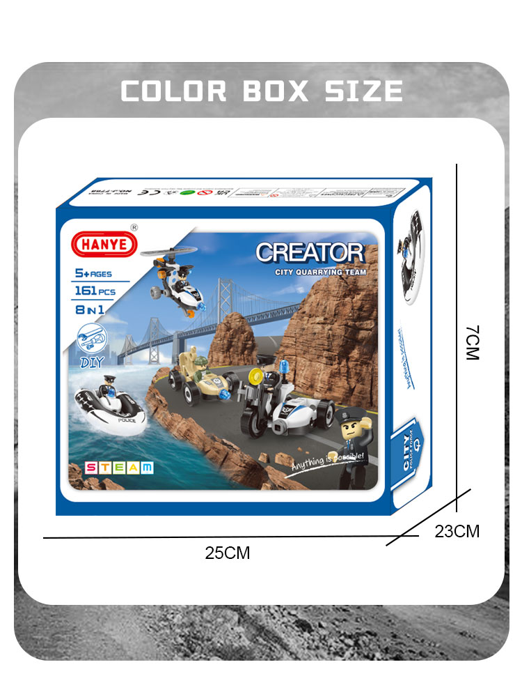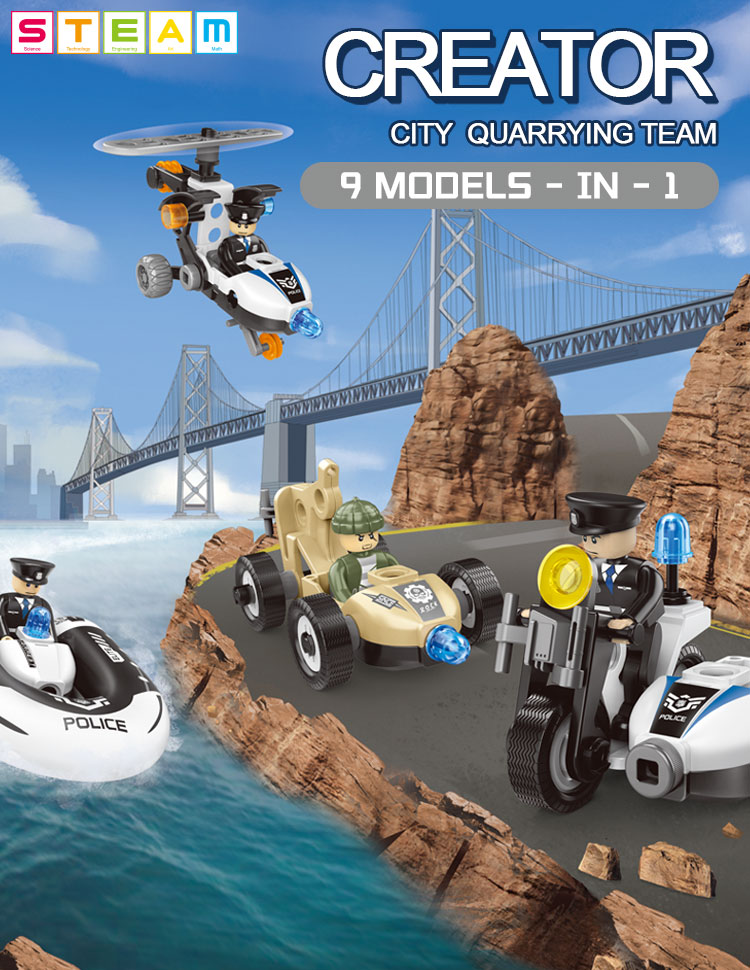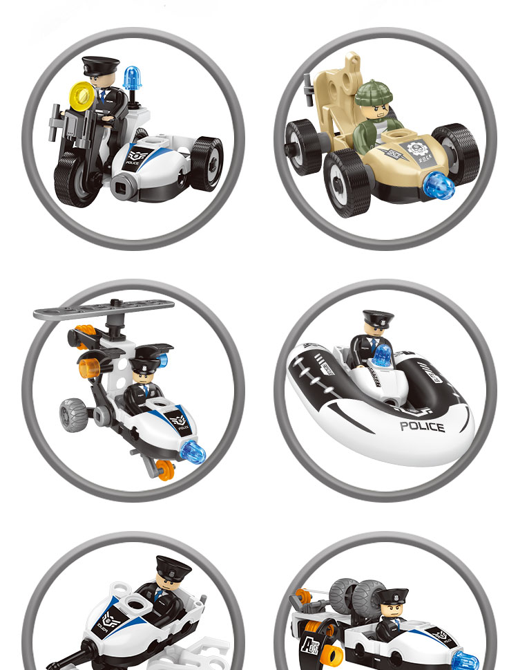 This build toy contains 161 parts that can be assembled into 8 kinds of police vehicle (can only build 1 shape every time). In order to help children build the vehicle smoother, we will provide the paper manual. The 3D assemble toy is of police theme, which is more imaginative.