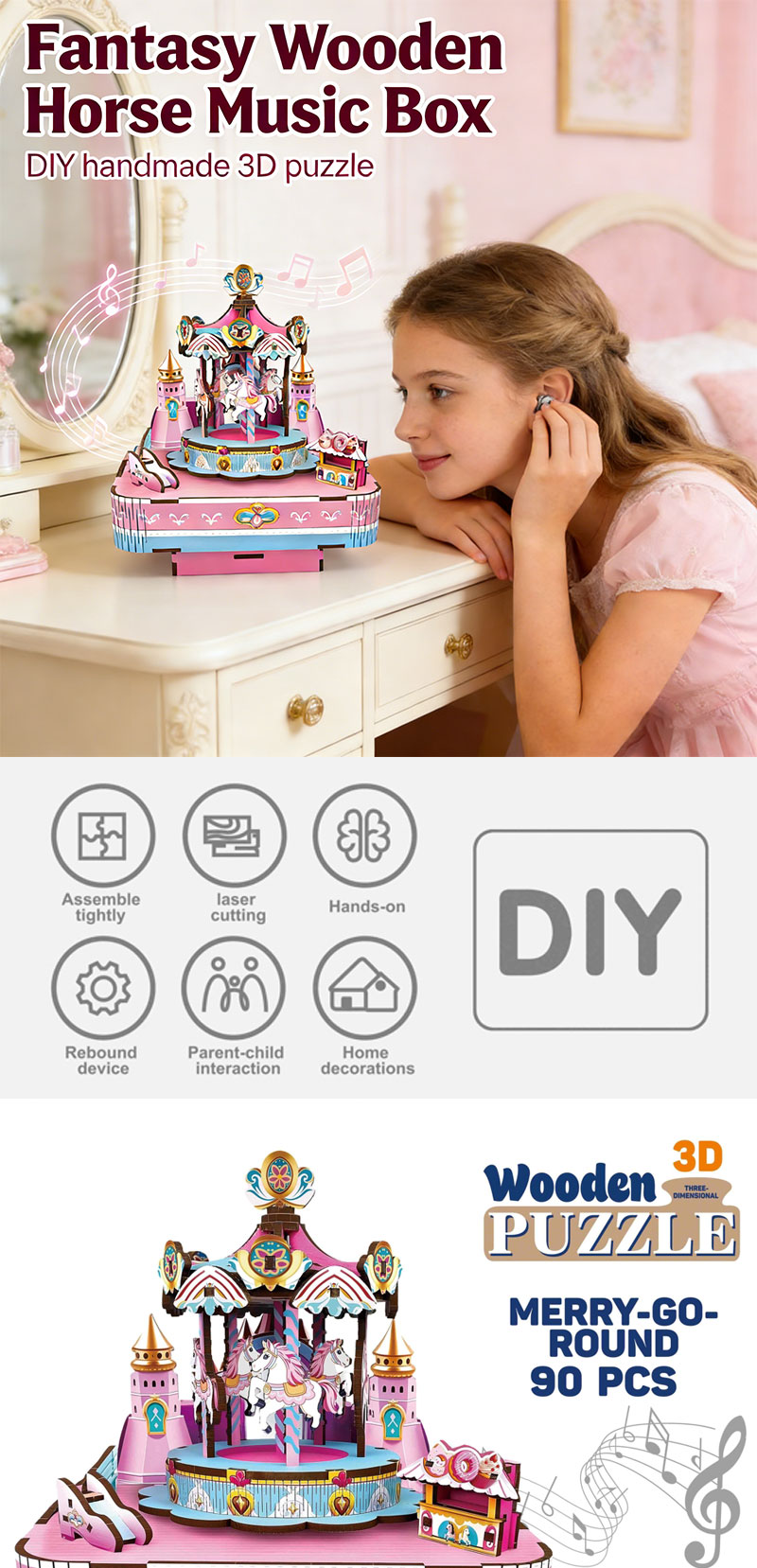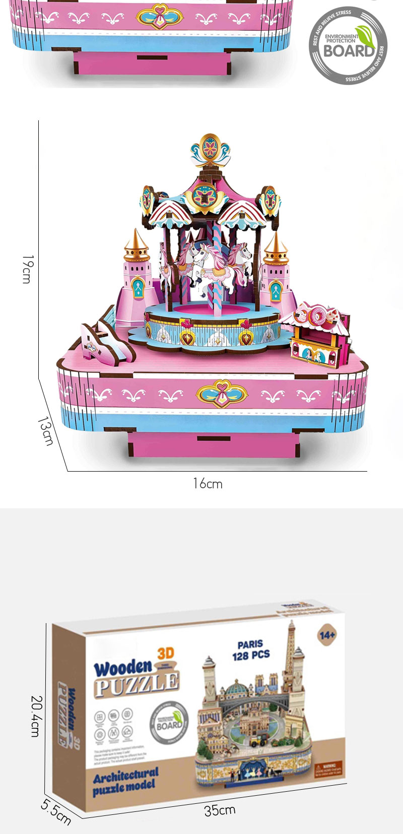 This product is a DIY 3D puzzle themed around a dreamy carousel. Children can assemble flat pieces into an exquisite three-dimensional model with their own hands. This entire process blends hands-on creation and spatial aesthetic enlightenment, delivering a strong sense of accomplishment.