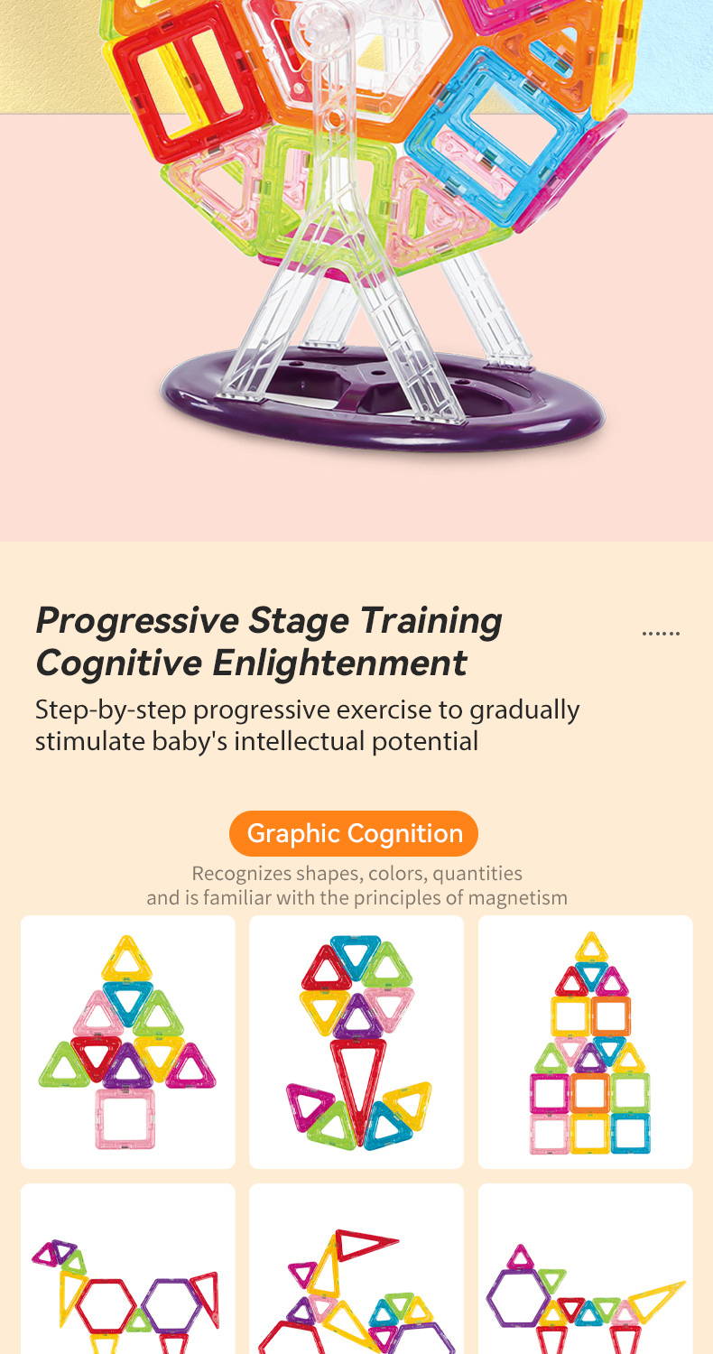 Our Magnetic Tiles Toy is not just a typical building block set. It is a powerful tool for developing children's spatial awareness, intelligence, and imagination. The magnetic tiles effortlessly snap together, allowing children to create various structures and shapes, fostering their problem-solving skills and cognitive development.