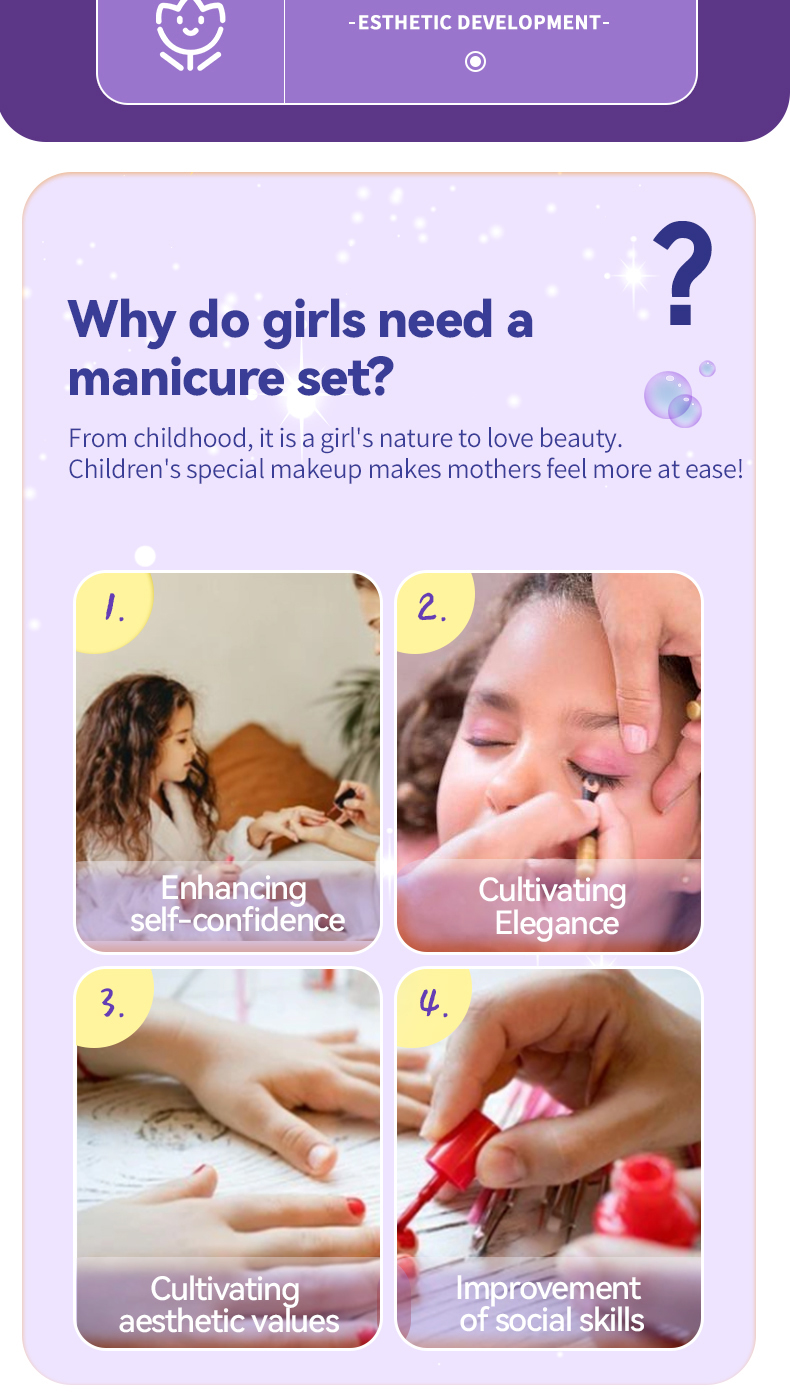 More than just a toy, our nail sticker sets introduce kids to the world of beauty and fashion in a child-friendly way. They teach children about color coordination, design, and personal style, making it an interactive learning experience.