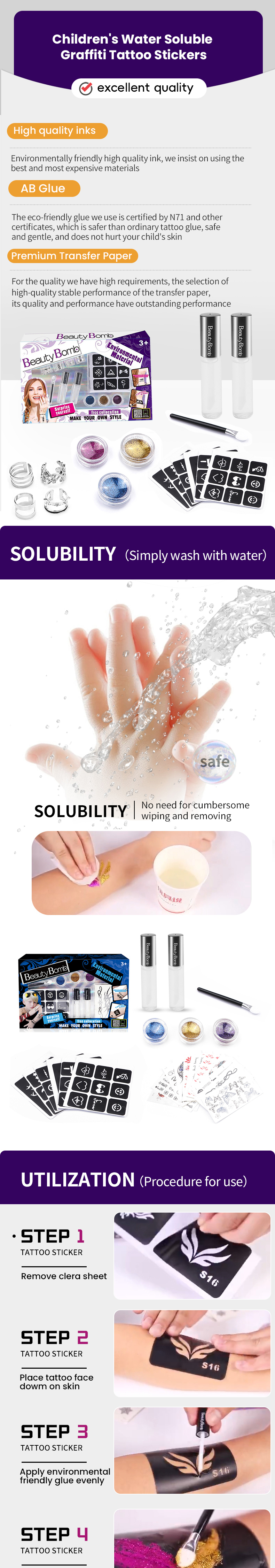 With our company's rigorous adherence to cosmetic safety standards and backed by certifications like EN71, 7P, ASTM, HR4040, CPC, GCC, MSDS, GMPC, and ISO22716, these temporary tattoo sets are perfect for children. They provide all the enjoyment and creative freedom without compromising on safety.