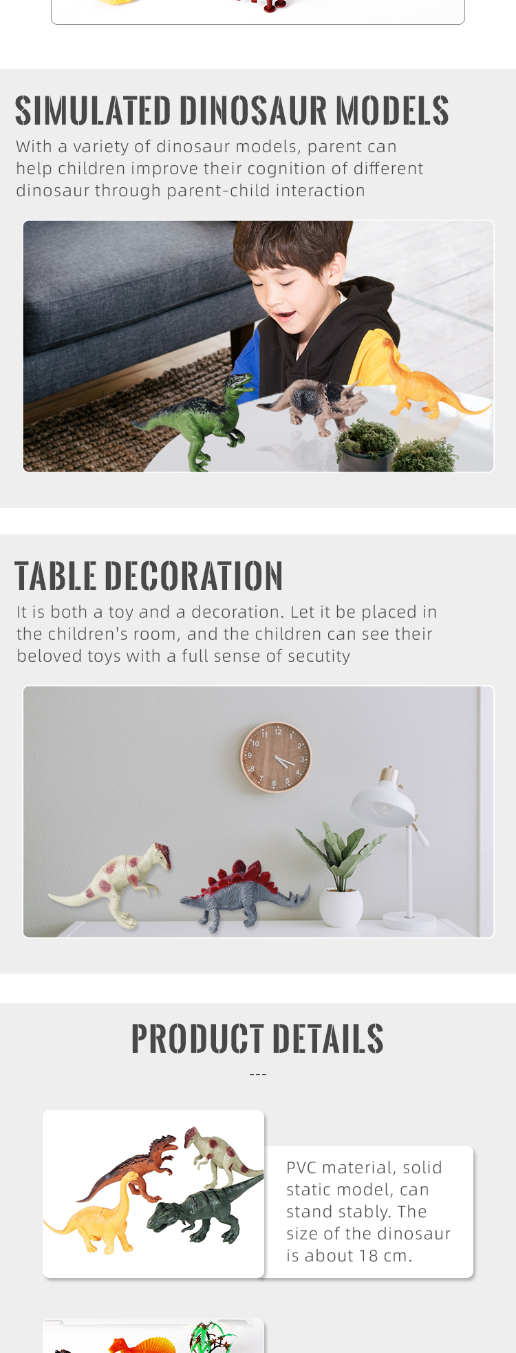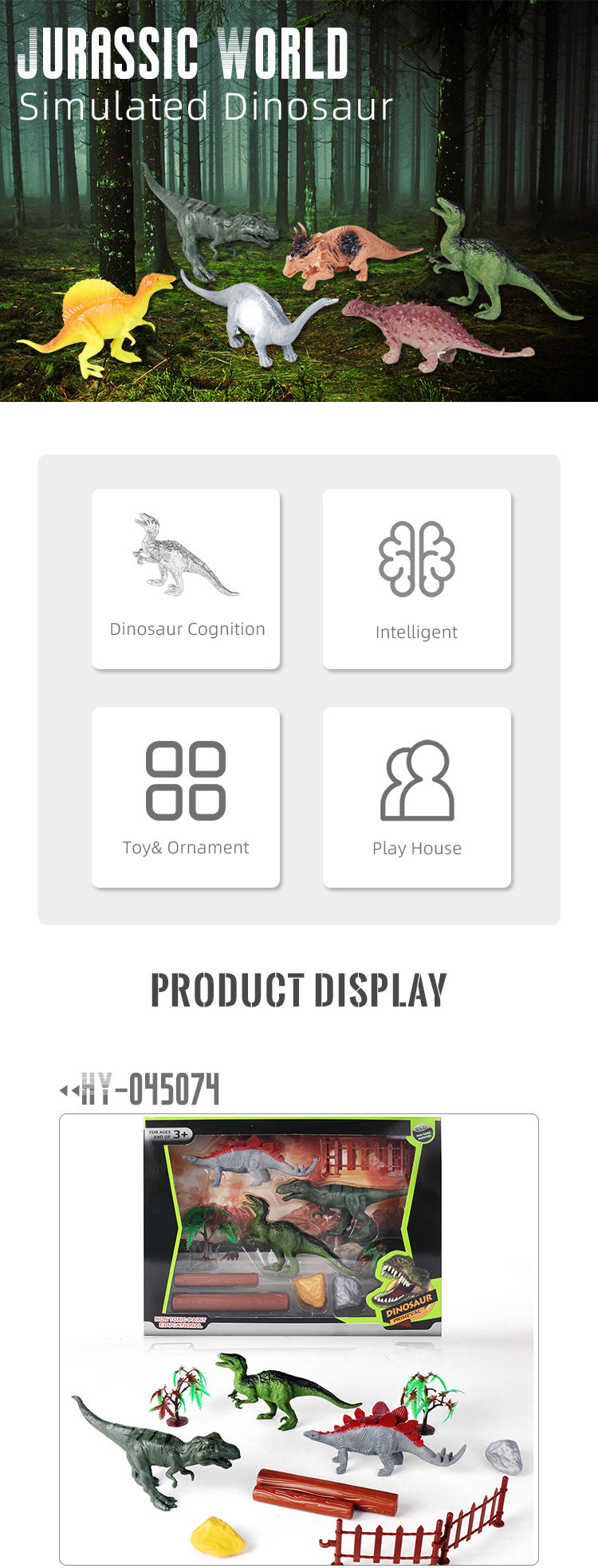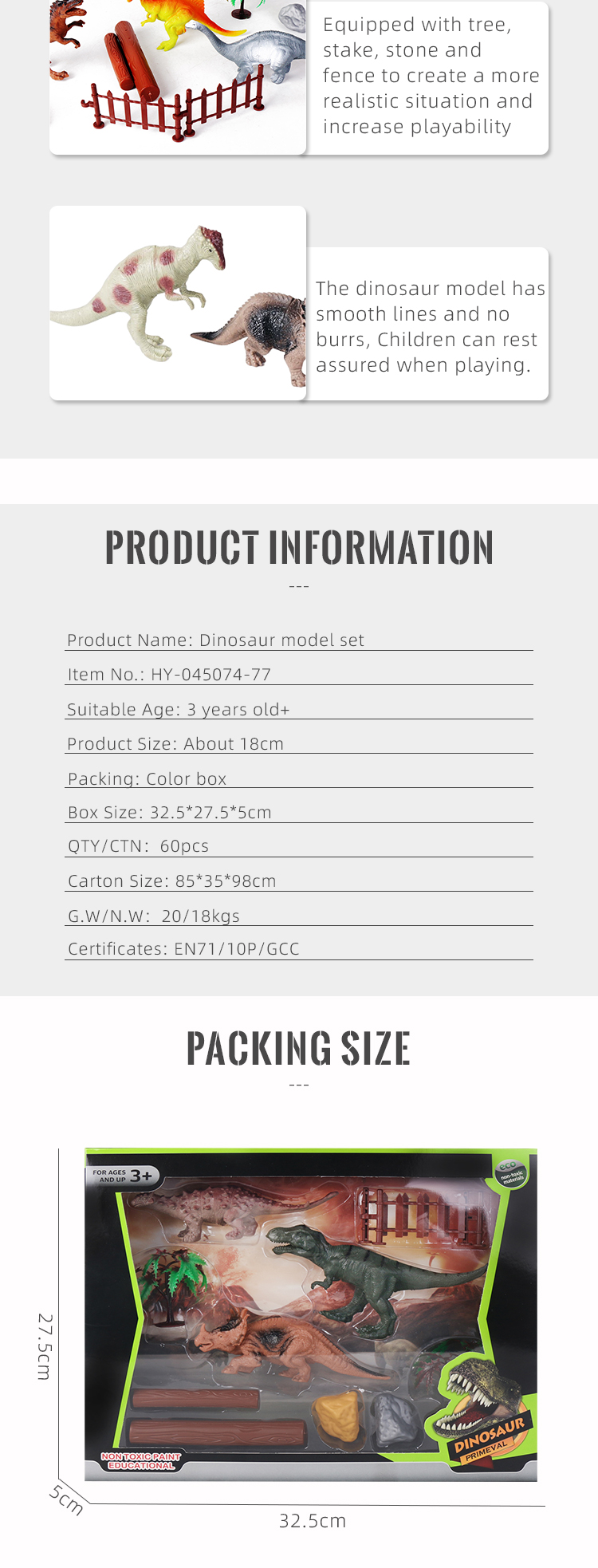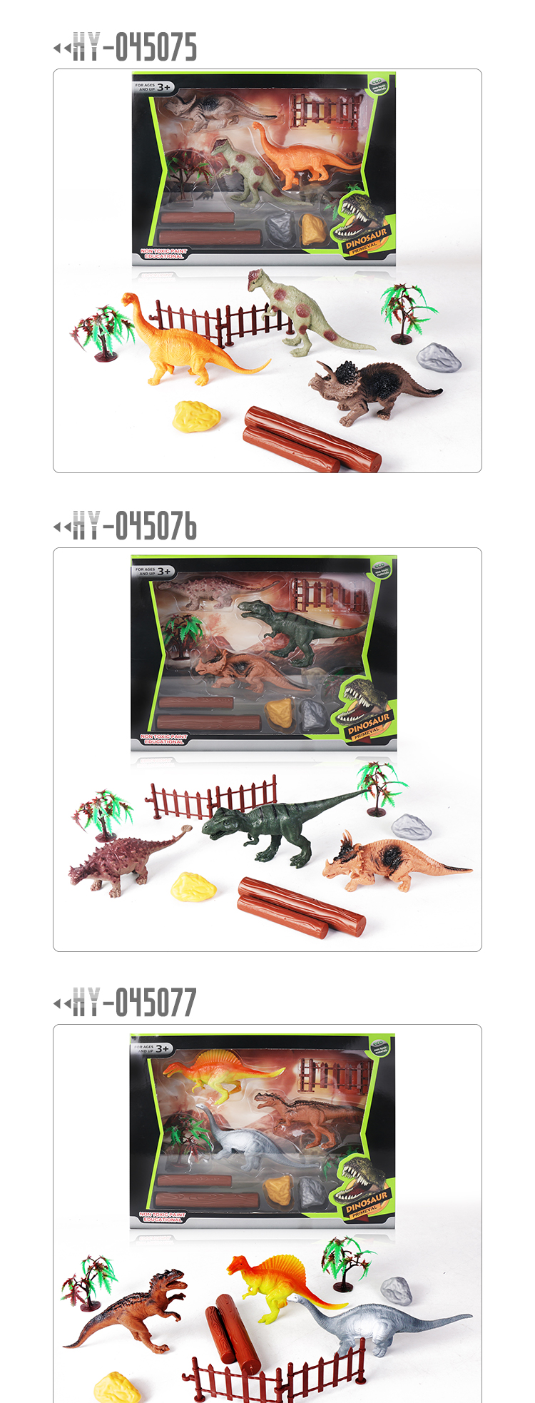 Each set includes three different dinosaurs with fence, tree and other scene accessories. Packaged in a window box, exquisite and beautiful, it is an ideal companion for children to explore the prehistoric world.