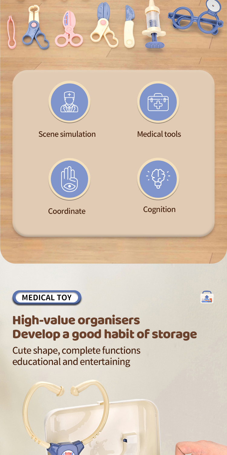 We understand that keeping play areas tidy can be a challenge, especially with so many pieces. That’s why the Simulation Medical Suitcase Toy Set comes with a large capacity storage box. This thoughtfully designed storage solution makes it easy for children to organize their medical tools after playtime, teaching them responsibility and the importance of cleanliness. The suitcase design also makes it portable, allowing kids to take their medical adventures wherever they go!