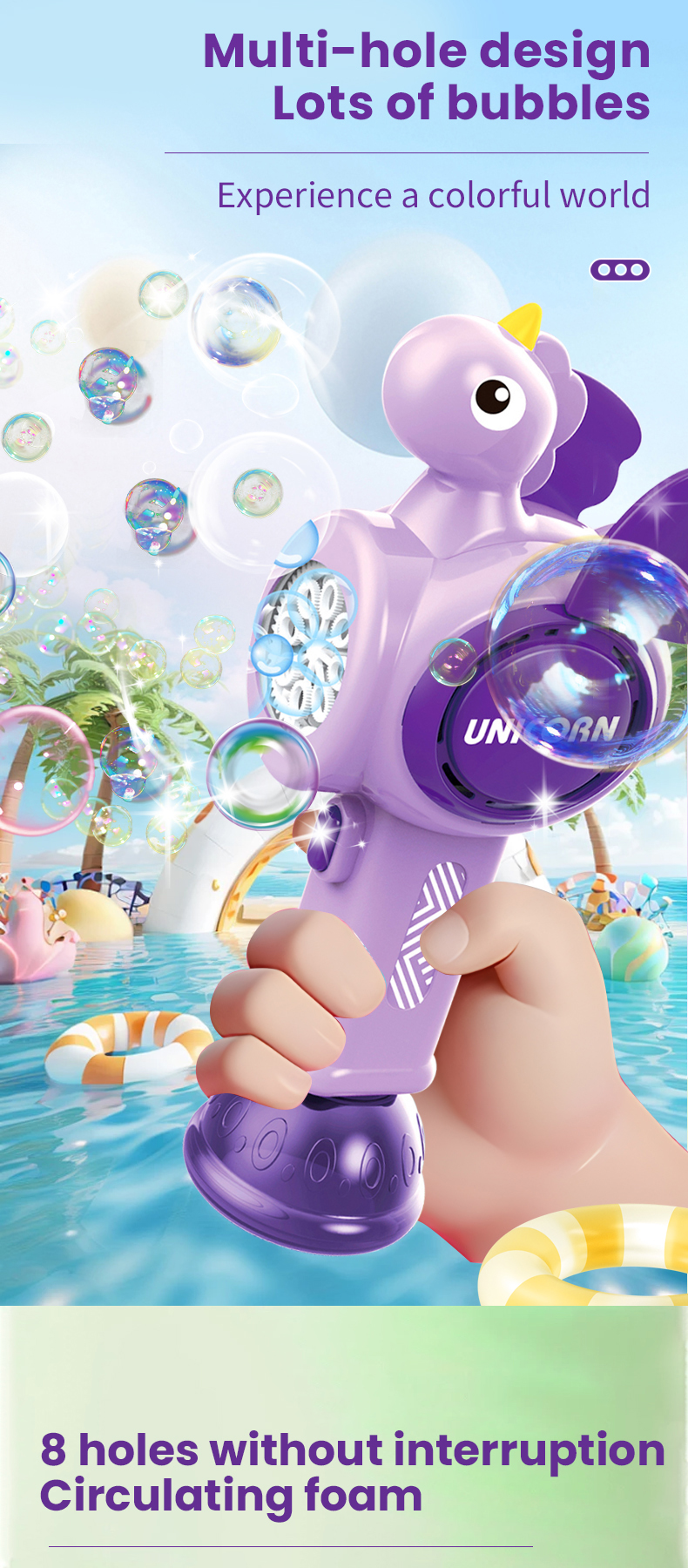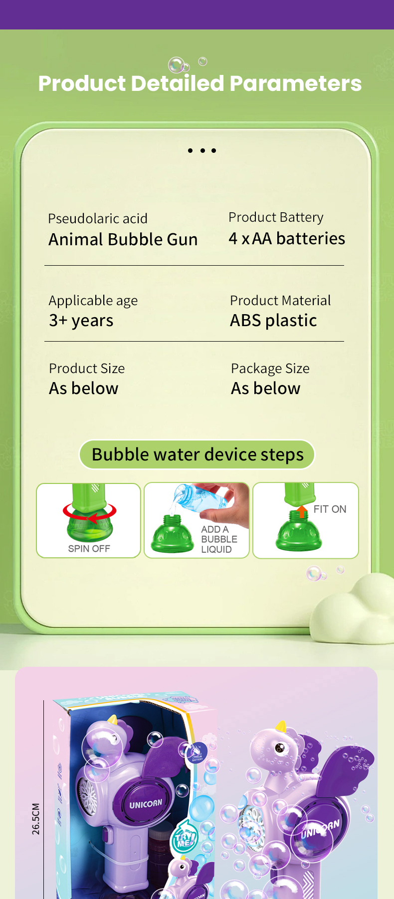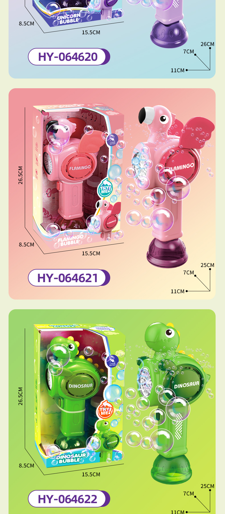 Introducing our exciting new Bubble Gun Toys, designed to bring endless fun and joy to kids of all ages! With a choice of adorable dinosaur, magical unicorn, or majestic flamingo designs, these bubble guns are sure to capture the imagination and provide hours of entertainment.