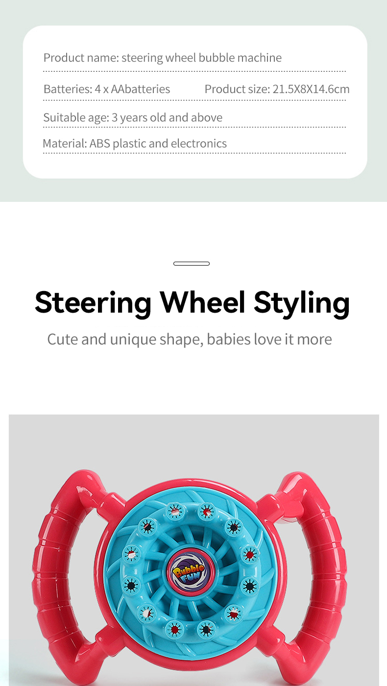 Introducing the ultimate summer toy for kids – the Electric Steering Wheel Bubble Machine with 110ml bubble solution! Powered by 4 AA batteries, this fun-filled toy is perfect for outdoor adventures at parks, beaches, backyards, and front yards. Made from durable ABS plastic, it features multiple bubble holes that create a mesmerizing display of bubbles. Whether you're hosting a party or just looking for a fun way to spend time with your little ones, this bubble machine is sure to provide endless entertainment. So why wait? Add some excitement to your child's summer today!