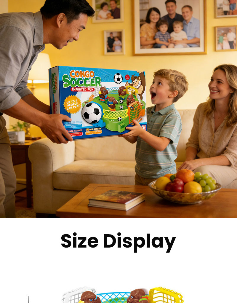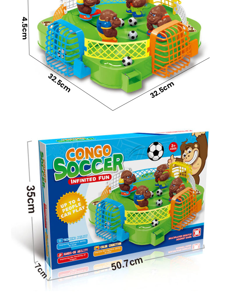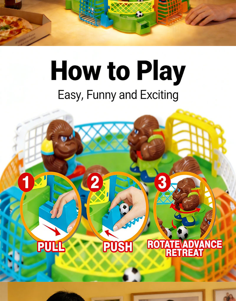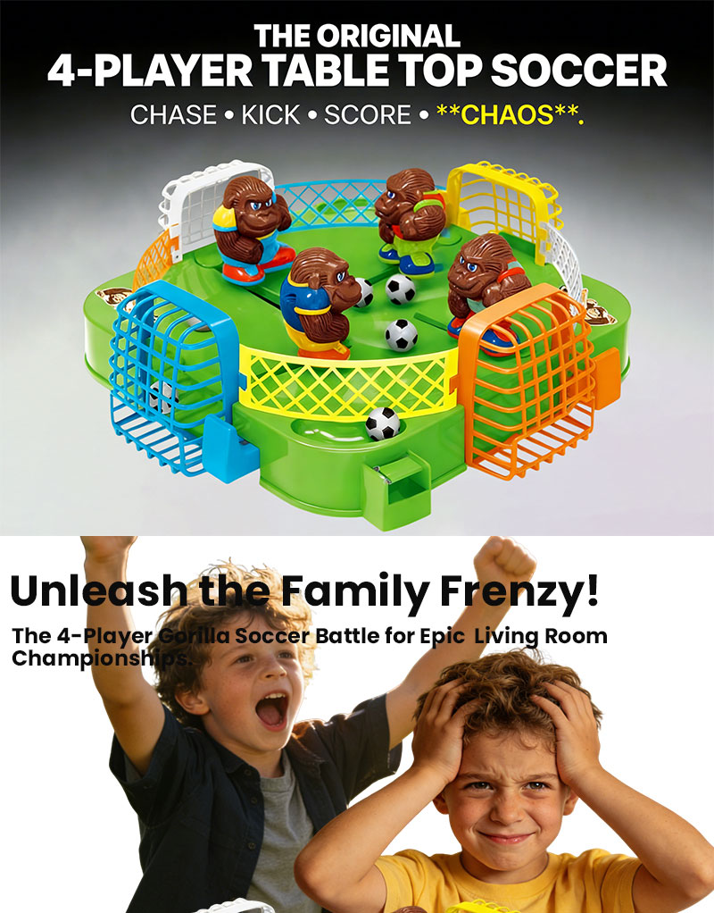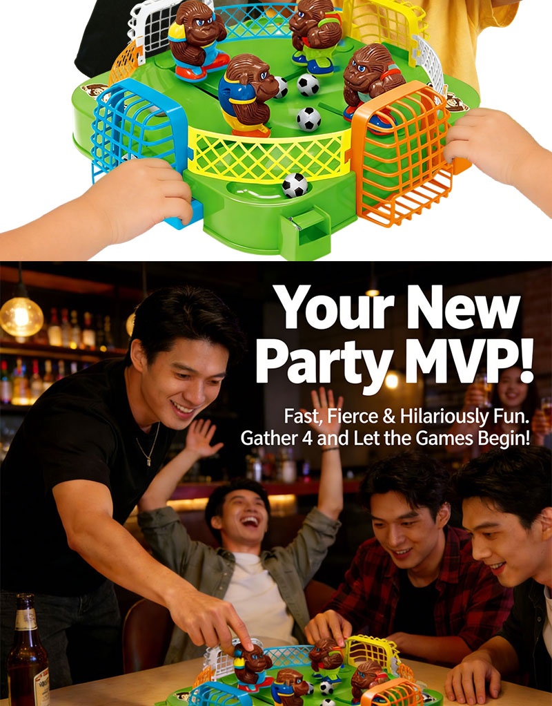 1. 4-Player Competitive Tabletop Soccer Game: An engaging board game for 4 players to compete simultaneously. Players control gorilla pieces to play soccer, aiming to be the first to kick the ball into the opponent's goal. Features simple rules and exciting competition.