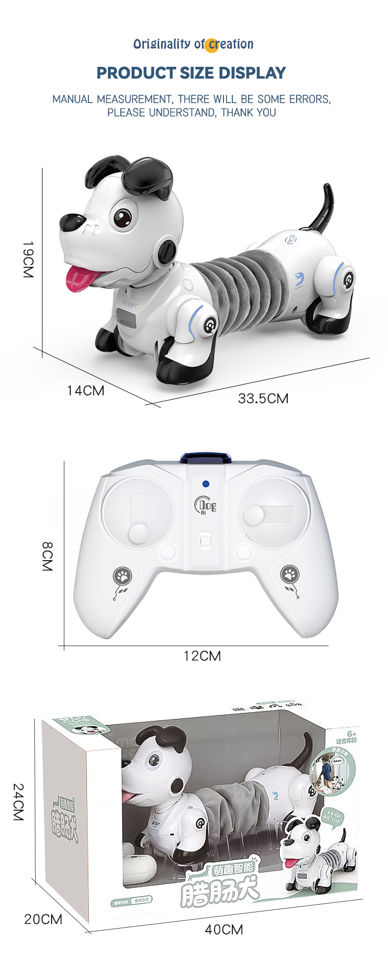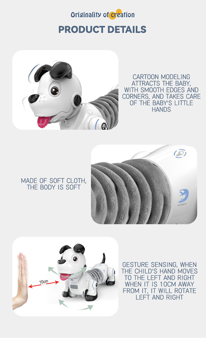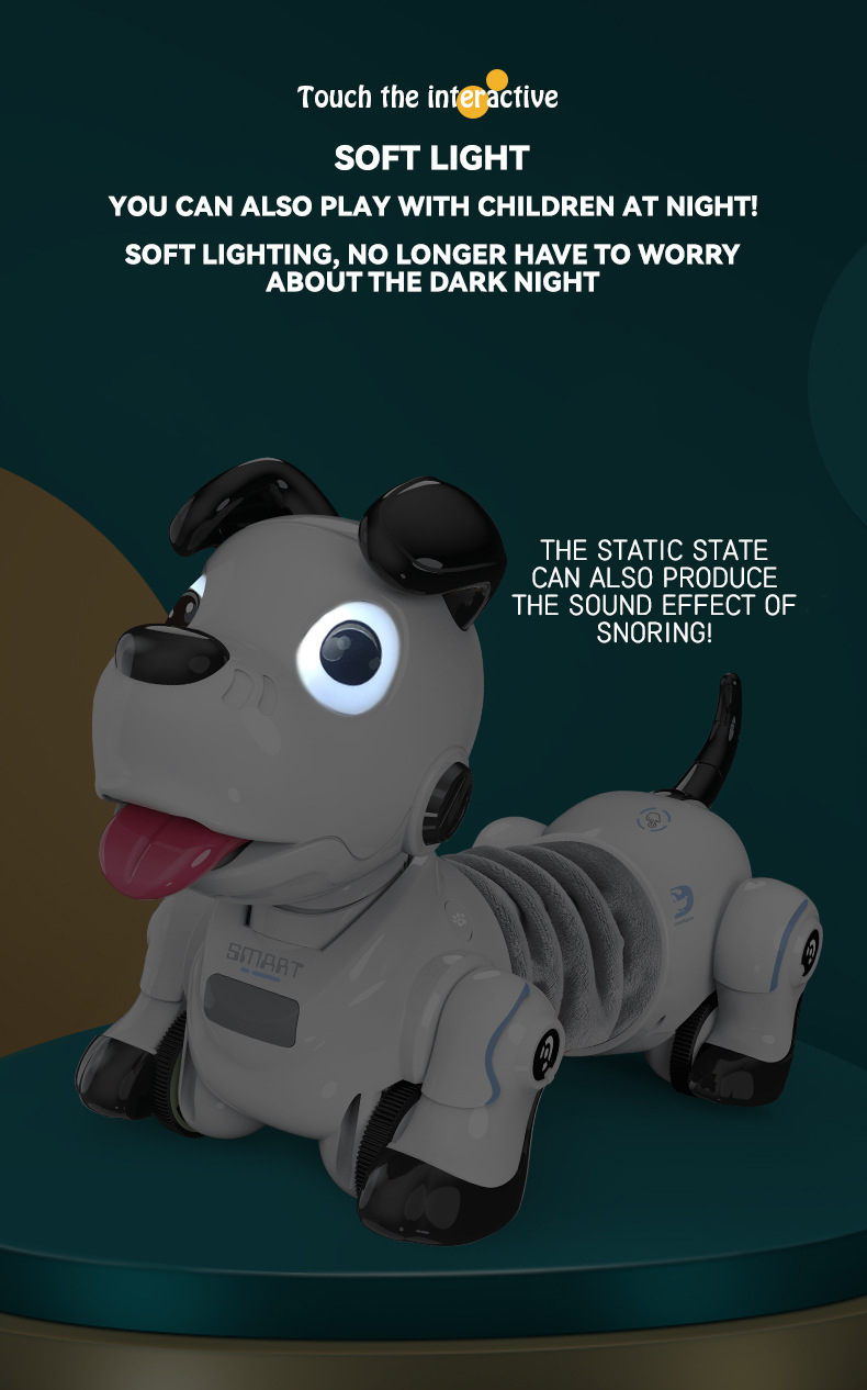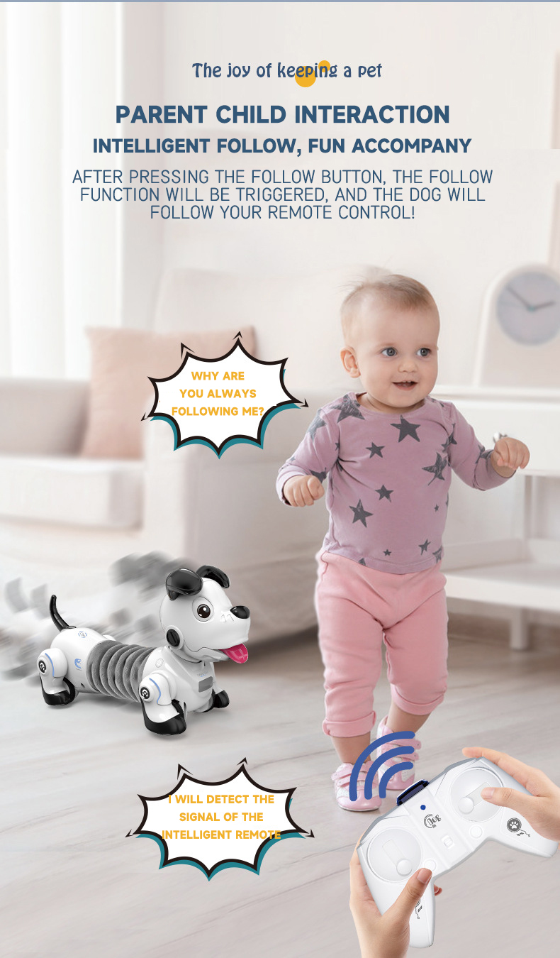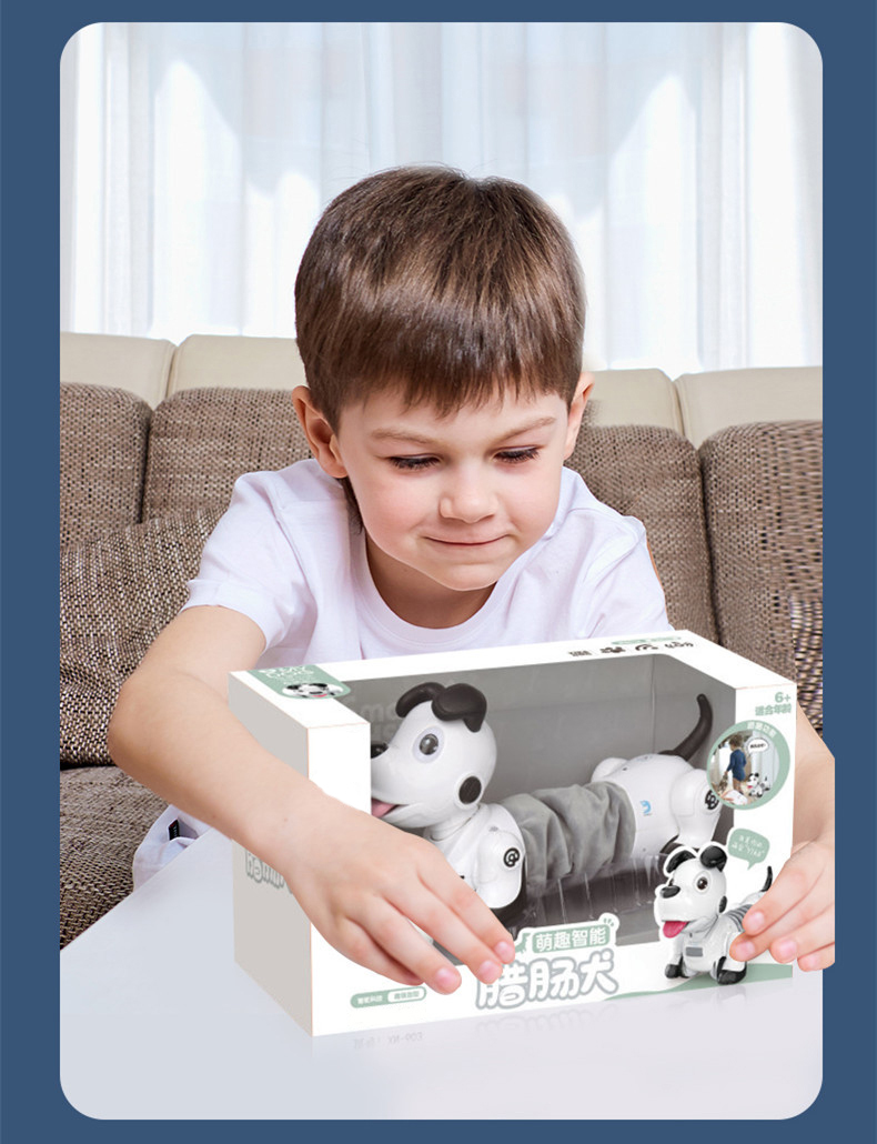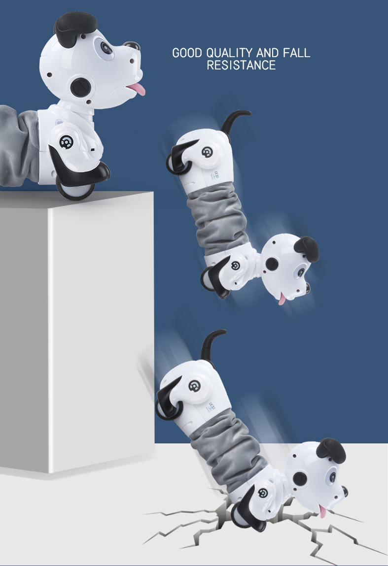 This battery-operated remote control puppy toy utilizes infrared remote control technology with a range of about 8 meters. The cute white dachshund design makes it an ideal intelligent interactive pet companion for kids.
