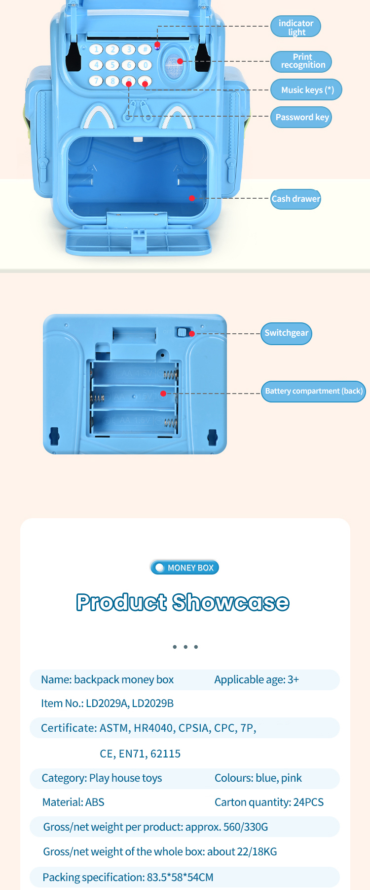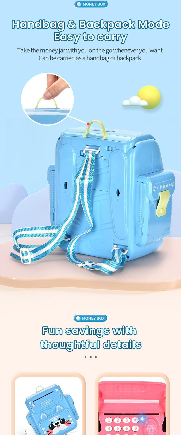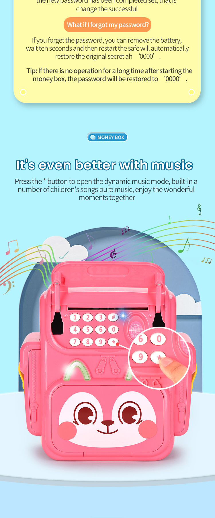 Even more interestingly, this piggy bank is equipped with sound and light effects. When children perform deposit or withdrawal operations, the piggy bank will emit bright lights while playing cheerful music. The flashing lights seem to celebrate a successful financial transaction, while the joyful music seems to cheer on the children's financial management behavior. The addition of these sound and light effects makes the entire saving process more fun and ceremonial.