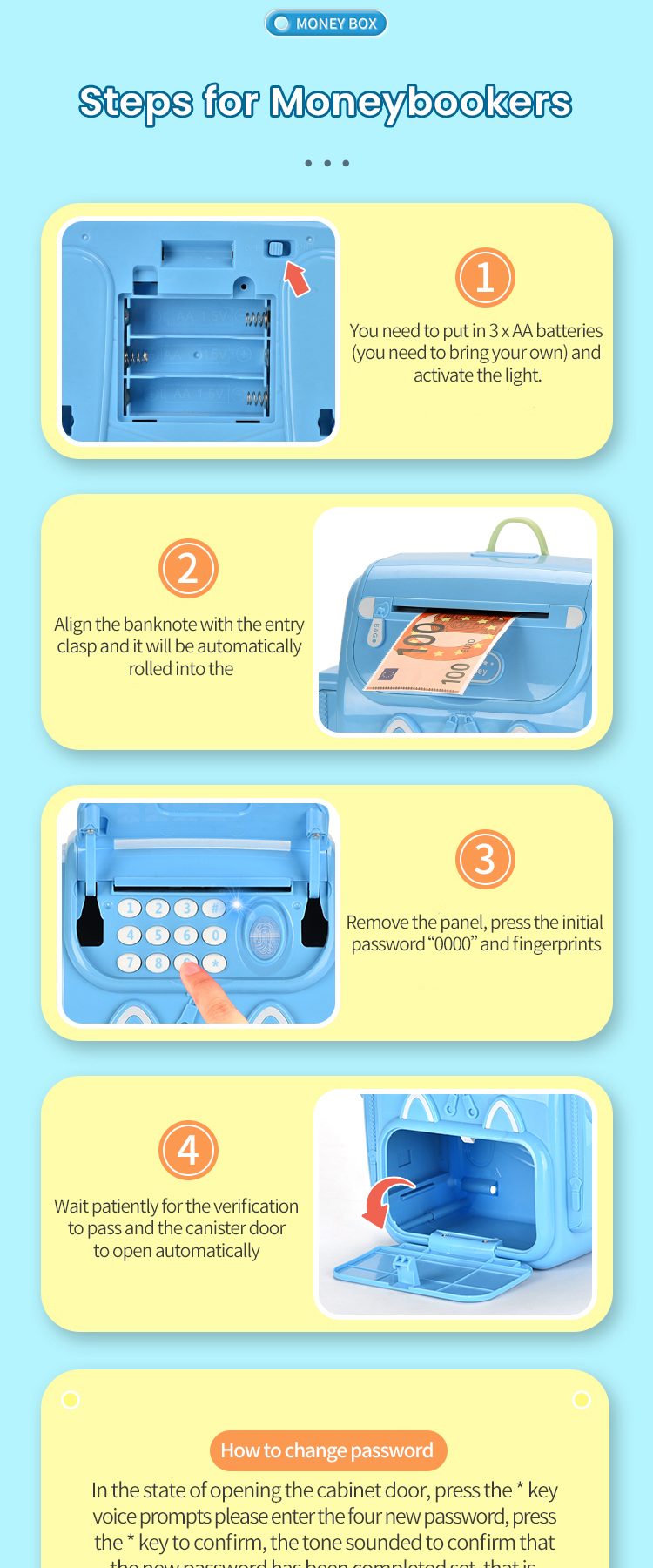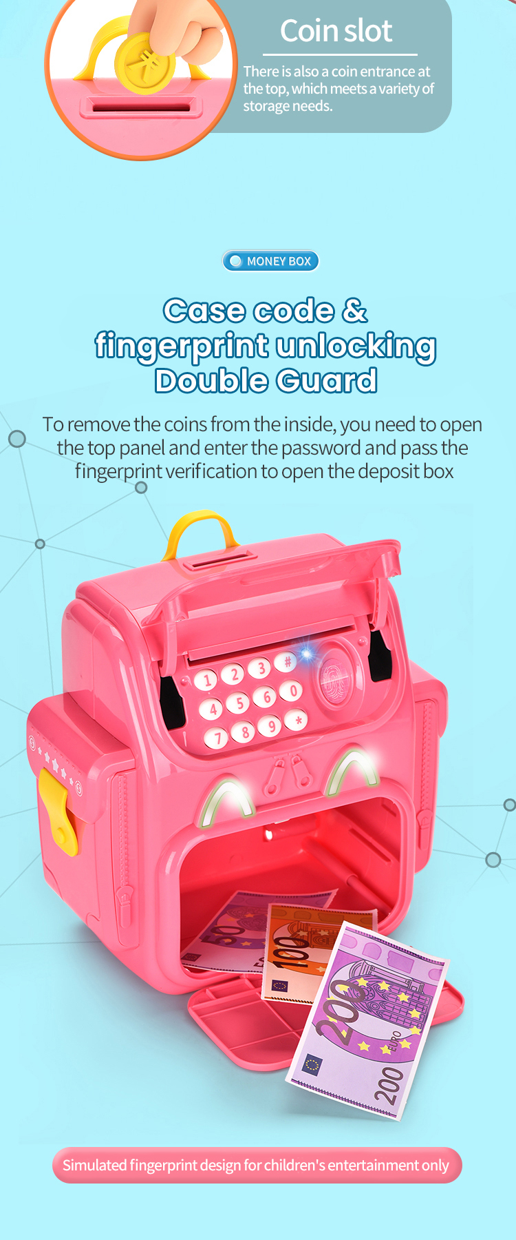 This piggy bank has a unique deposit and withdrawal function. It comes with password and fingerprint unlocking features, just like a real ATM machine, providing children with a highly realistic experience. Children can set their own passwords, and when they want to deposit or withdraw money, they need to enter the password or use fingerprint recognition. This not only adds fun but also teaches children to protect their property privacy.