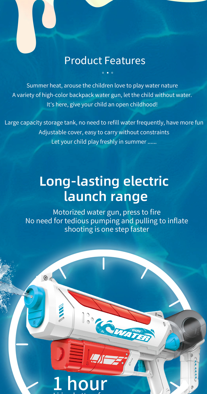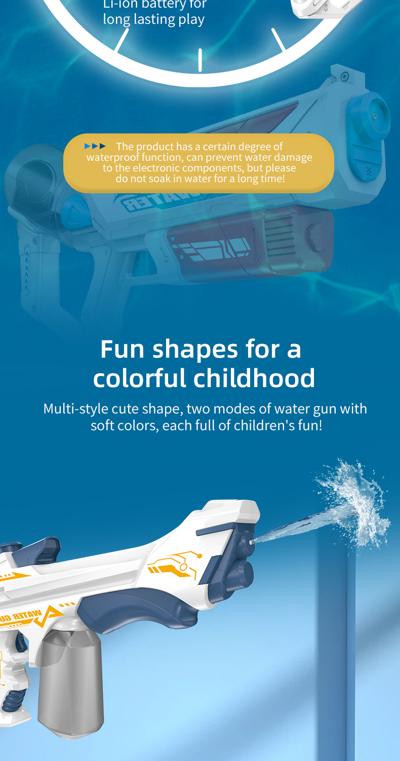 Introducing the newest addition to the world of water toys - the electric water gun! This exciting toy is equipped with a rechargeable battery and comes with a convenient USB charging cable, ensuring endless hours of fun in the sun. Our electric water guns are designed for both kids and adults, making them the perfect addition to any outdoor event or party. With multiple packing methods available, including head card bag and color box, our water guns are easy to transport and make great gifts for any occasion. Whether you're heading to the beach, park, or swimming pool, our electric water guns are guaranteed to be a hit. They're the perfect choice for a summer outdoor best-selling toy, providing hours of entertainment and enjoyment for all ages.