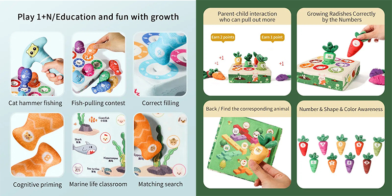 In addition, our plush radish pulling toy/fishing toy also includes color recognition and number matching games. This adds an extra layer of learning and fun to the toy, allowing your child to develop their skills in a way that is engaging and enjoyable.