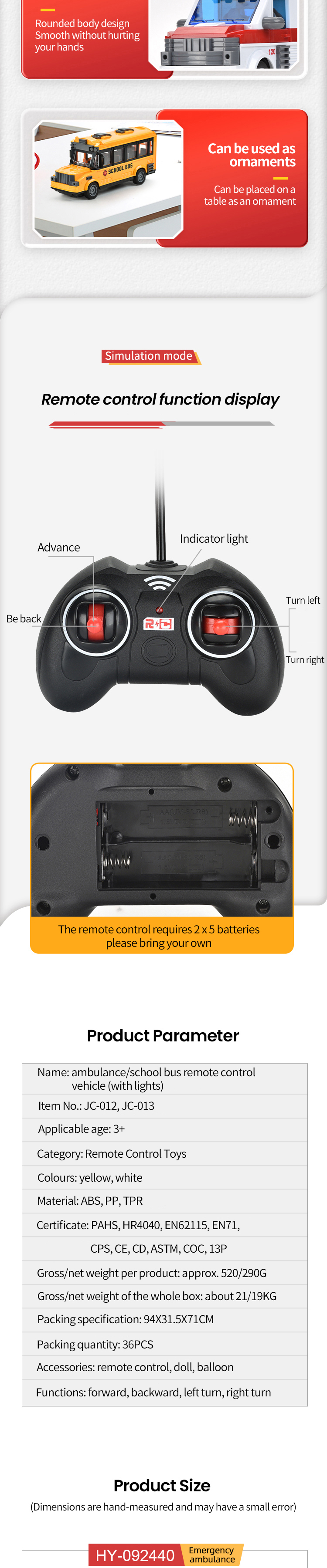 Introducing the ultimate playtime experience for your little ones: the RC School Bus and Ambulance Toys! Designed to ignite imagination and creativity, these battery-operated vehicles are perfect for children who love adventure and role-playing.