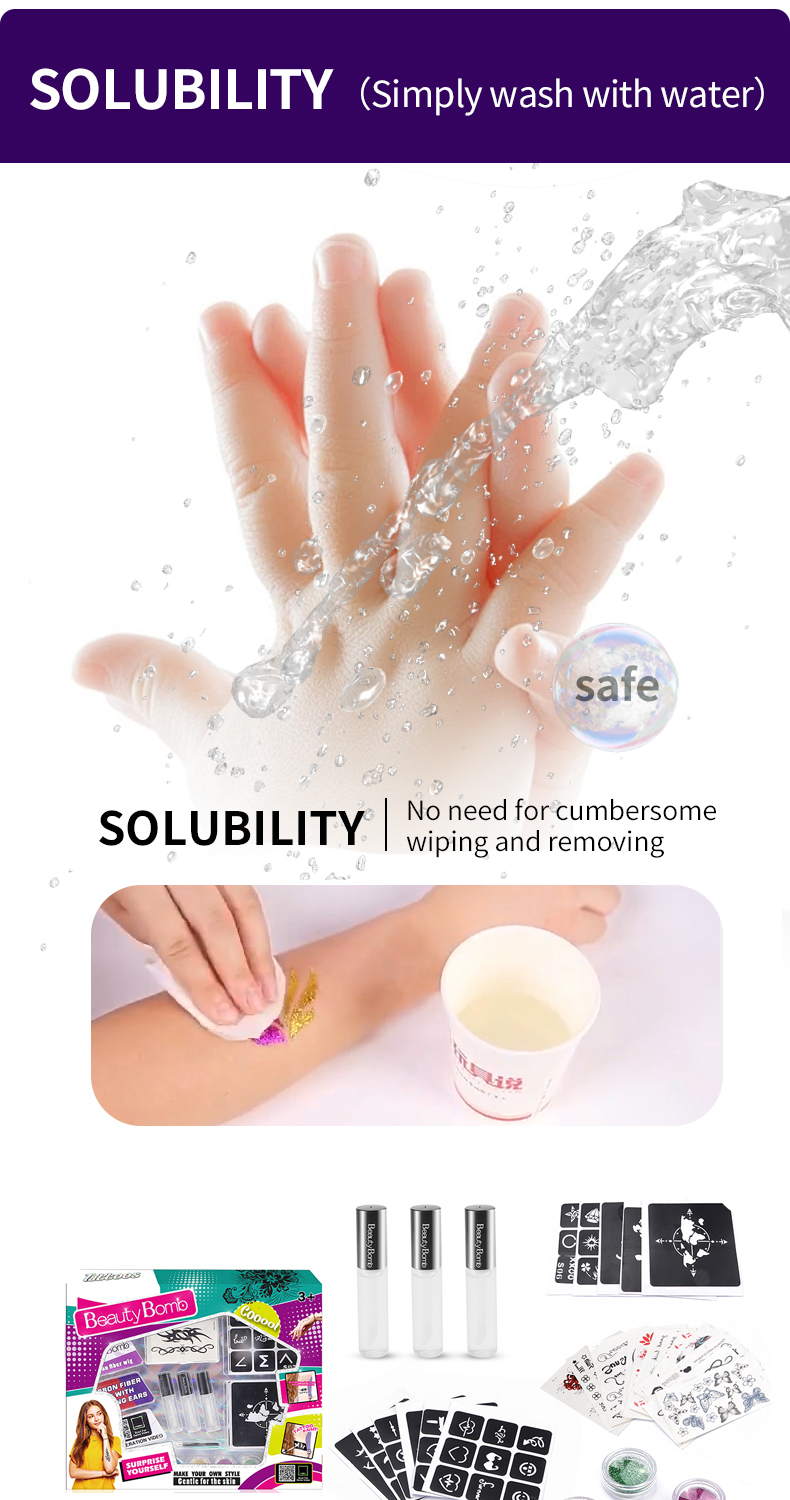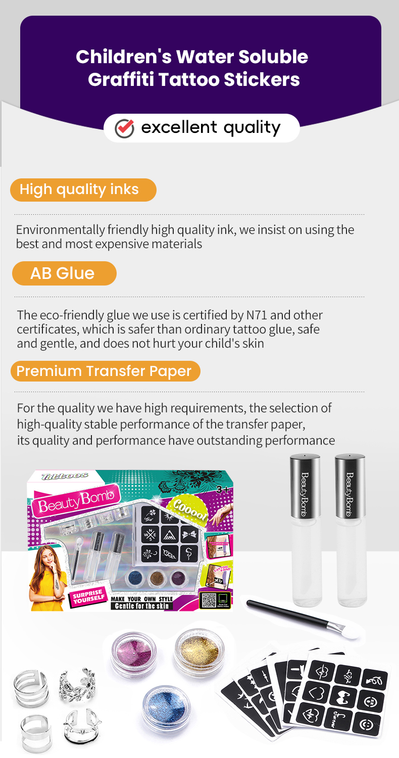 With our company's rigorous adherence to cosmetic safety standards and backed by certifications like EN71, 7P, ASTM, HR4040, CPC, GCC, MSDS, GMPC, and ISO22716, these temporary tattoo sets are perfect for children. They provide all the enjoyment and creative freedom without compromising on safety.