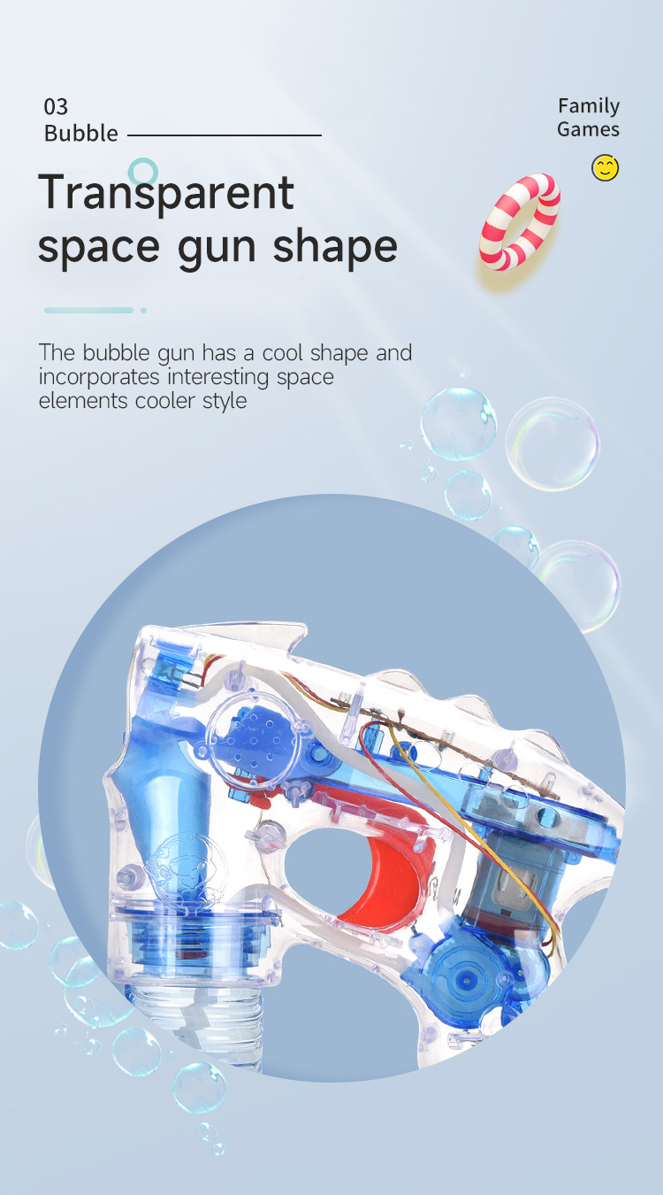 Summer Outdoor Battery Operated Lighting Transparent Space Bubble Blower Gun Kids Automatic Bubble Gun with Bottle Solution
