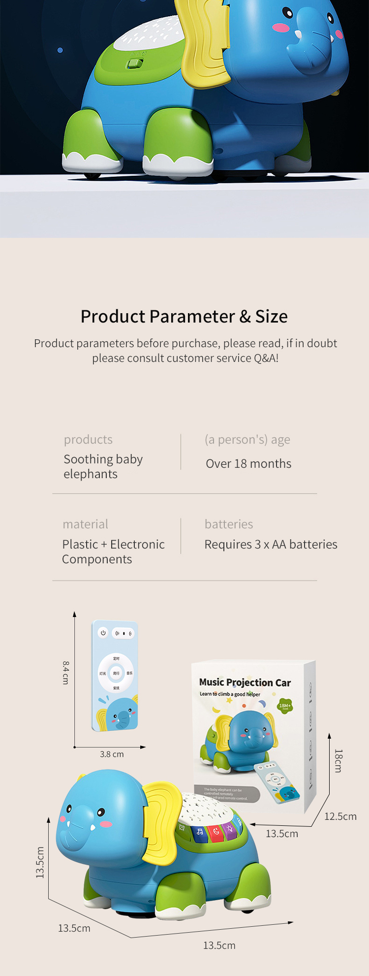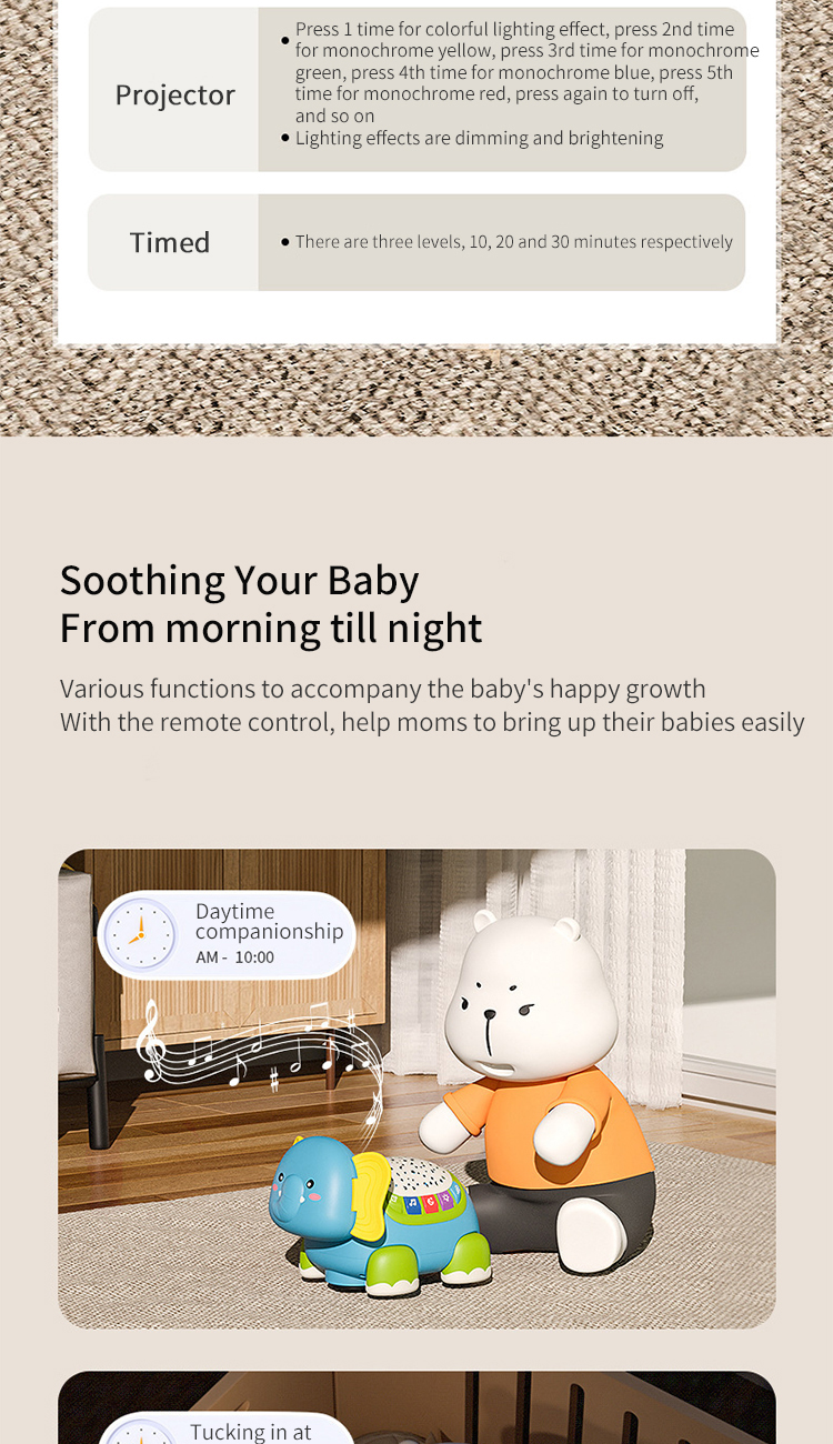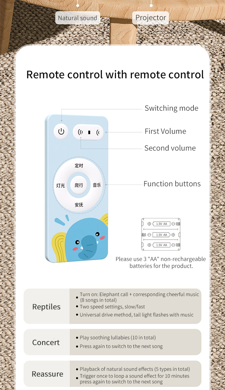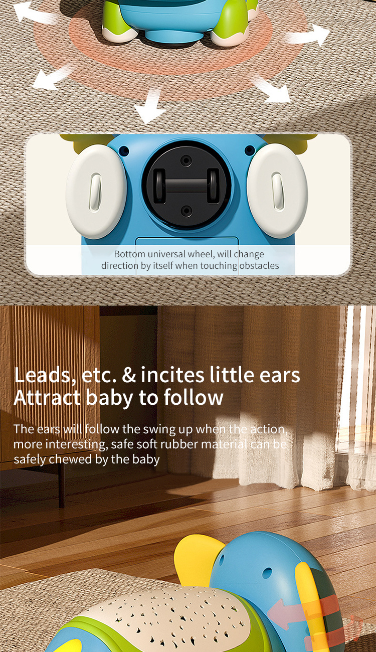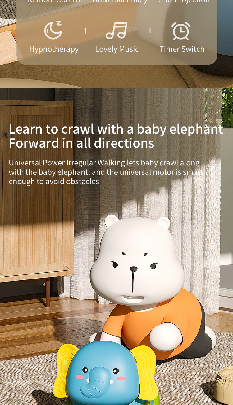 1. Learn to crawl mode: Elephant call+8 joyful music, automatically switching after the music ends; The speed can be set to two gears, and when the speed button is turned off, the mode is universal drive.