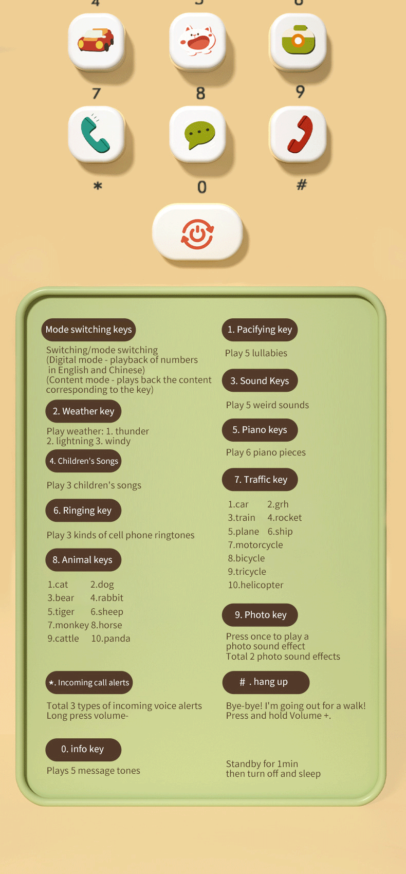Overall, the Bilingual Mobile Phone Toy offers a perfect balance of education and entertainment for young children. It is designed to stimulate their senses, encourage learning, and foster parent-child interaction. With its bilingual language options, musical and light features, and adorable cartoon design, this toy is sure to become a favorite for children and parents alike.