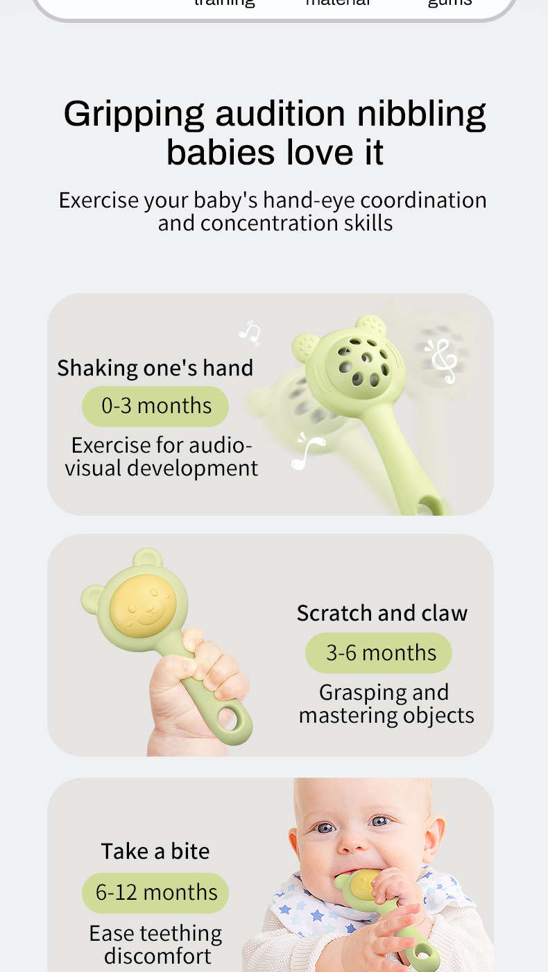 1. Innovative design, combined with dental glue and ringing bell, designed specifically for the teething needs of young babies.