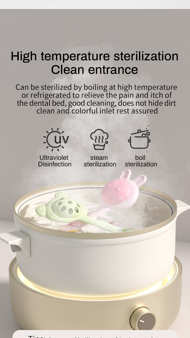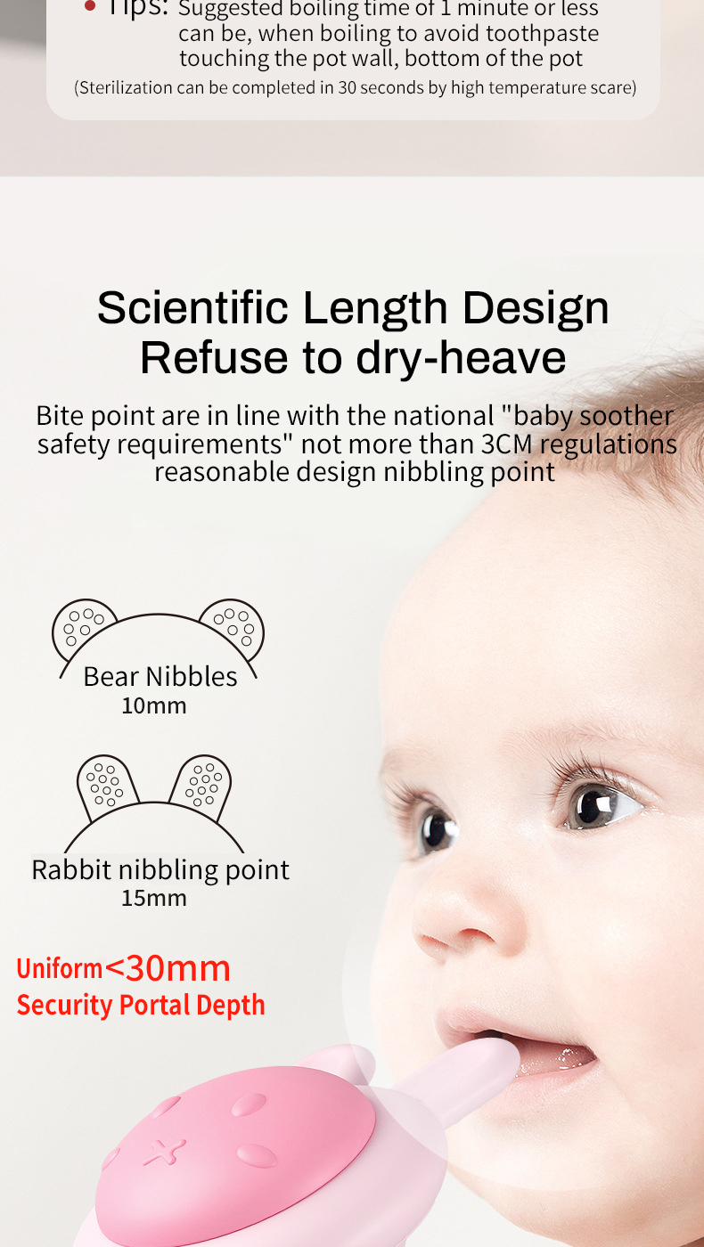 2. Pacifier grade silicone material, high-temperature disinfection, and gum SPA enjoyment.