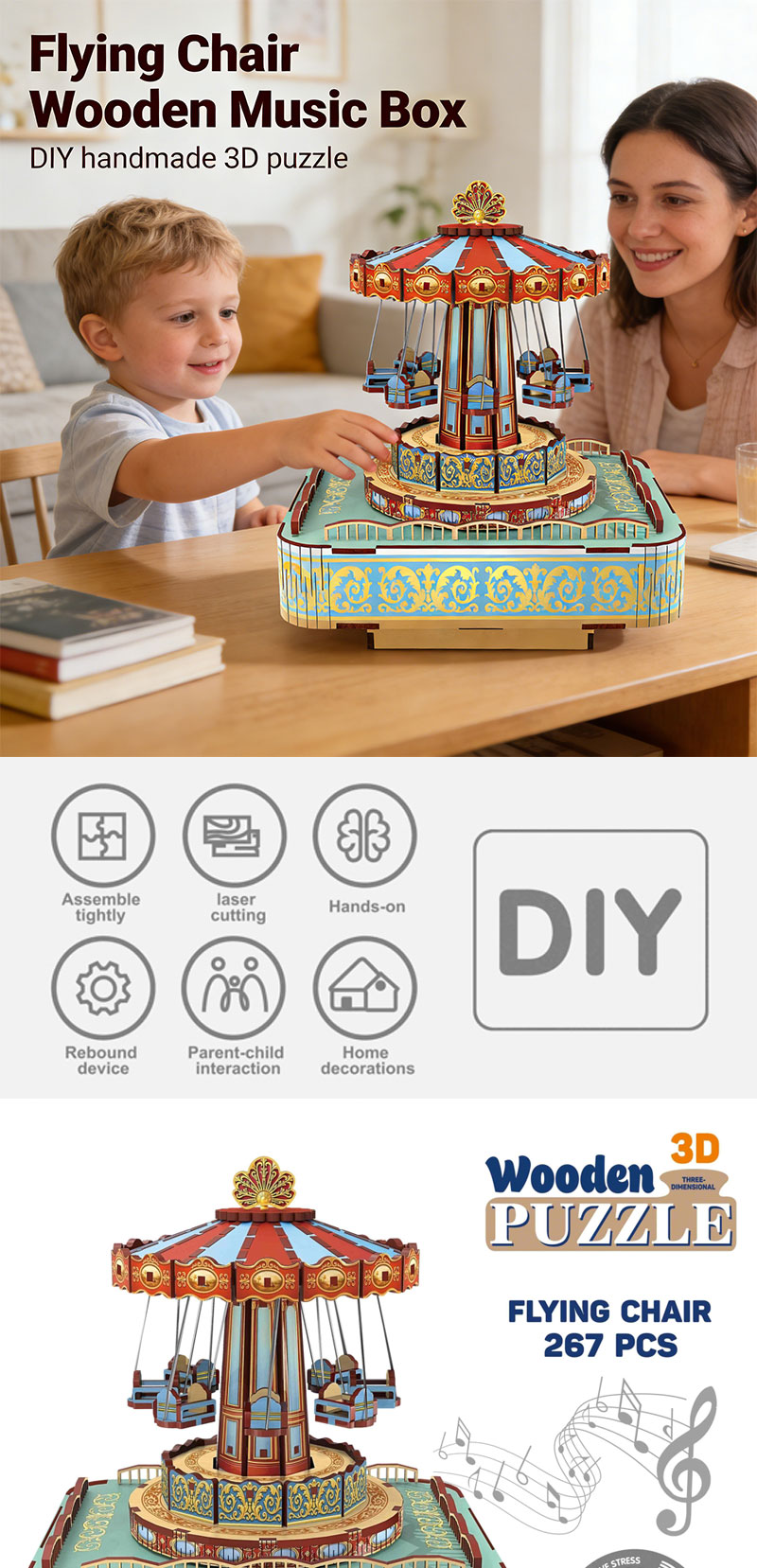 Wooden Swing Ride DIY 3D Puzzle Toys – Rotating Music Box & STEM Model Kit
